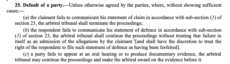 A2: Sections 25, 30, and 38 do not provide an independent power to terminate proceedings; instead, they "only denote the circumstances" in which the tribunal is empowered to resort to Section 32(2) and thereby terminate the proceedings,. For instance, Section 38 details the circumstances related to non-payment of deposits that enable termination,.