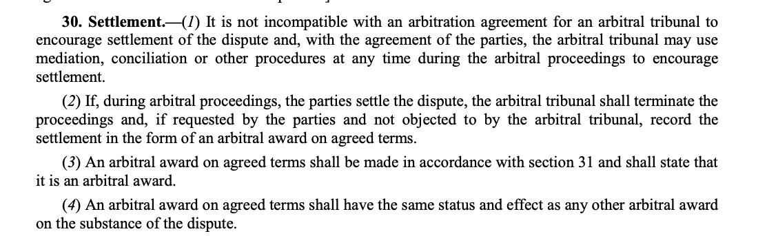 Arbitration and Conciliation Act - Section 30- The arbitral tribunal is required to terminate the proceedings, upon the settlement of the dispute by the parties.- once the dispute between the parties stands settled, nothing remains for the arbitral tribunal to adjudicate upon. (Para 81)