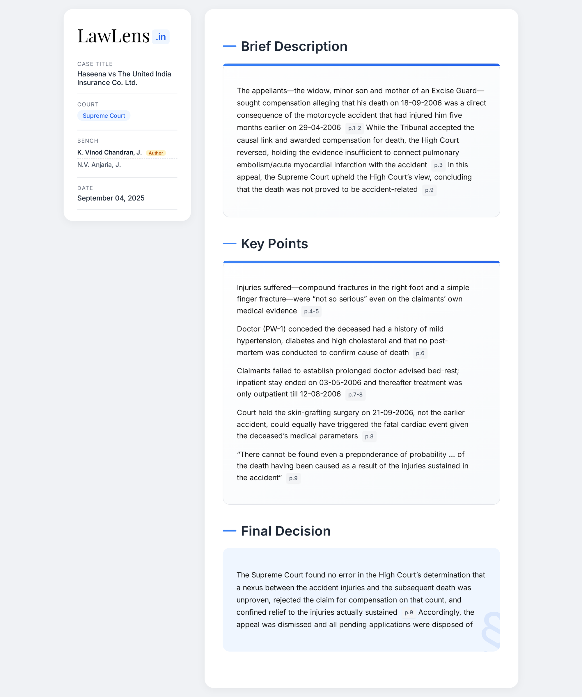 The case is Haseena & Ors. v. The United India Insurance Co. Ltd. & Anr., decided on September 4, 2025, by Justices K. Vinod Chandran and N.V. Anjaria; neutral citation is 2025 INSC 1075.