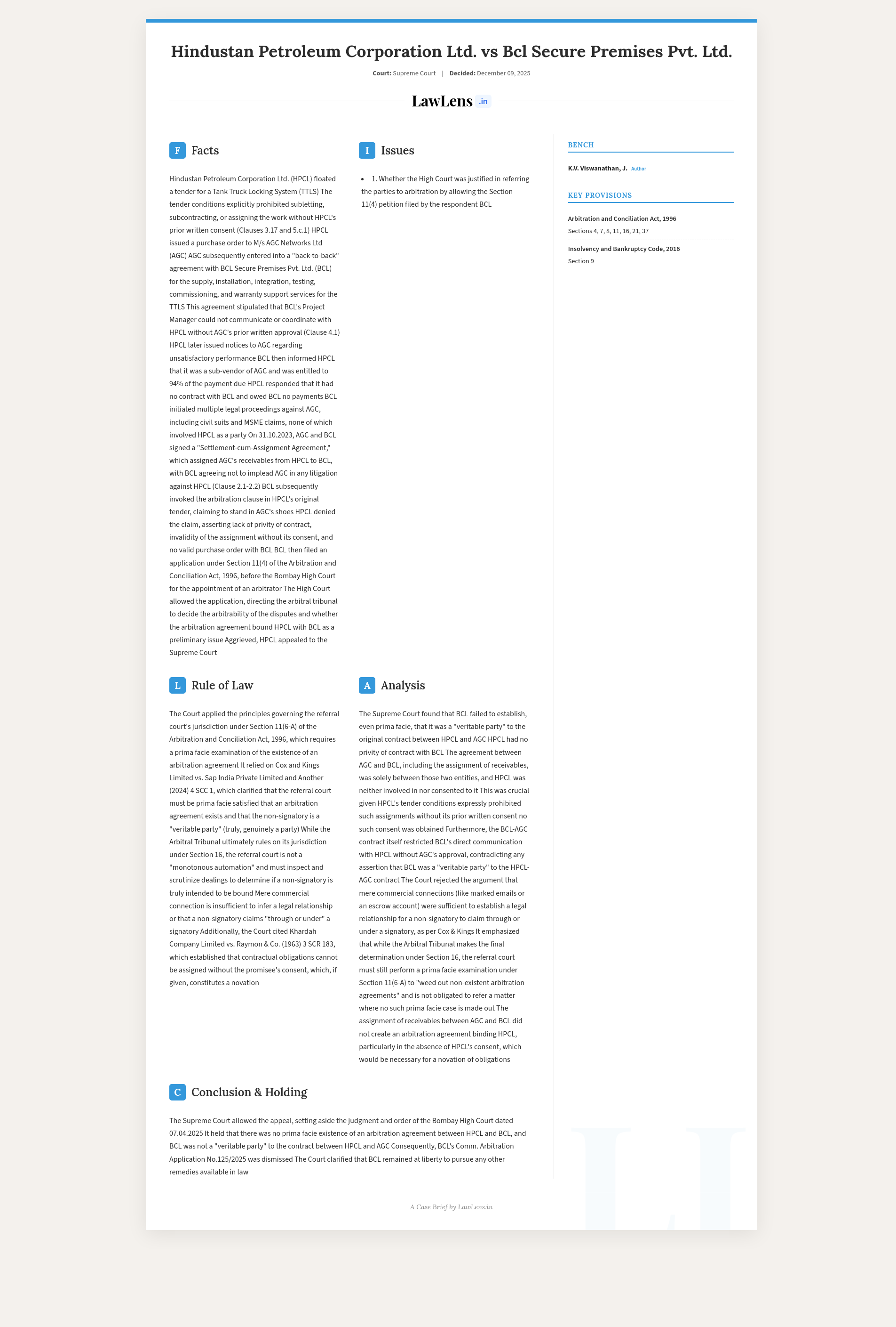 Hindustan Petroleum Corporation Ltd. v. BCL Secure Premises Pvt. Ltd.; 2025 INSC 1401 - S.11 Arbitration Act - Veritable Party