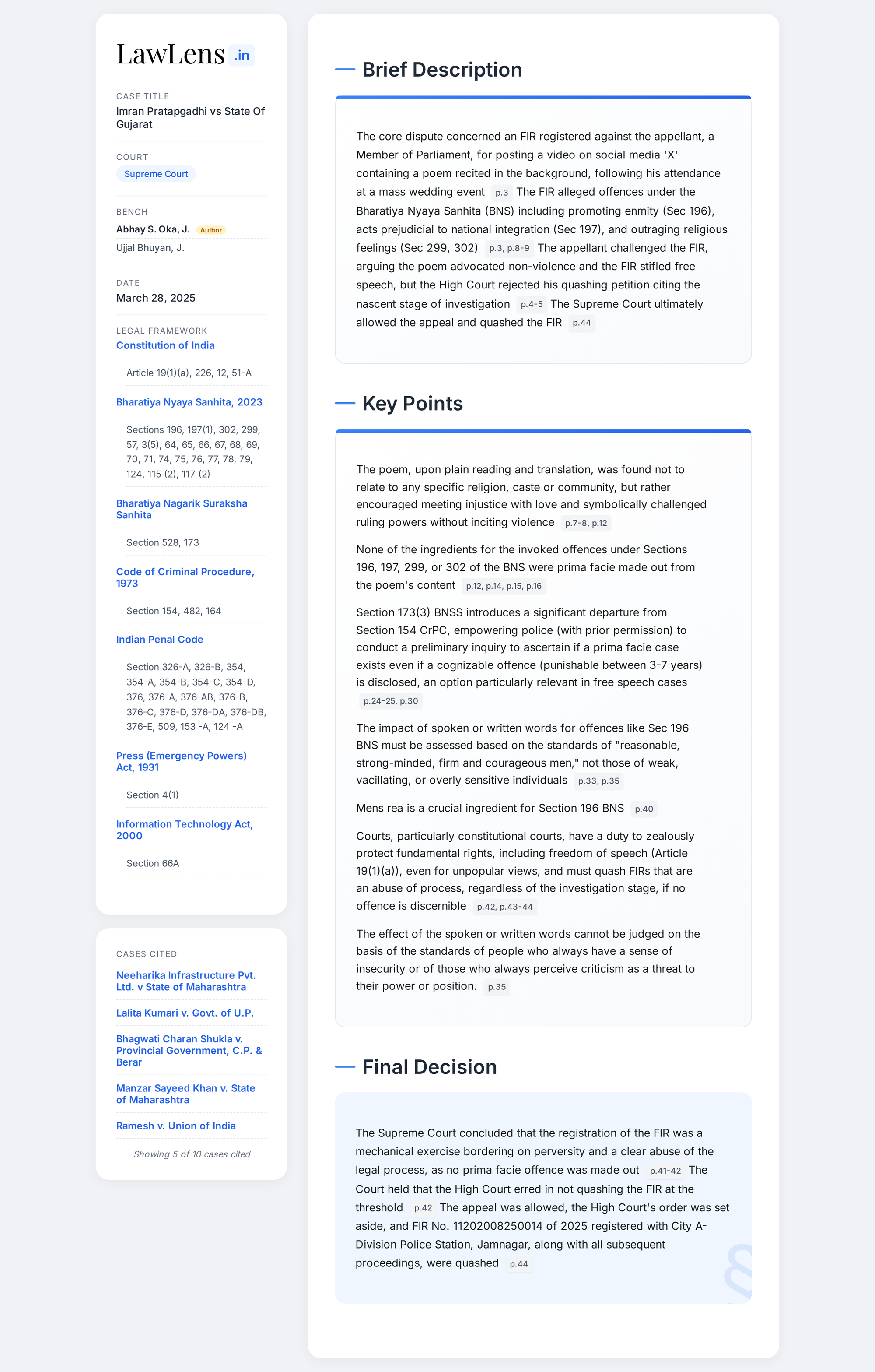 Imran Pratapgadhi vs State Of Gujarat 2025 INSC 410 - Ss. 173 BNSS - S.196 BNS - Article 19 Constitution - Freedom of Speech - Preliminary inquiry