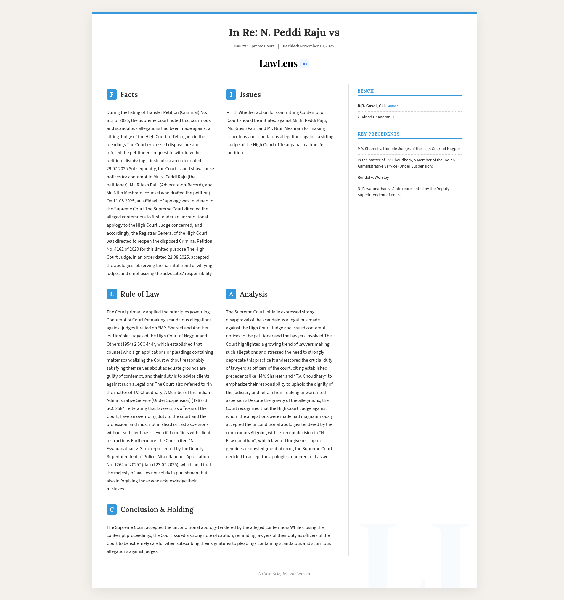 In Re: N. Peddi Raju 2025 INSC 1321 - Contempt of Court - Pleadings - Allegations Against Judges