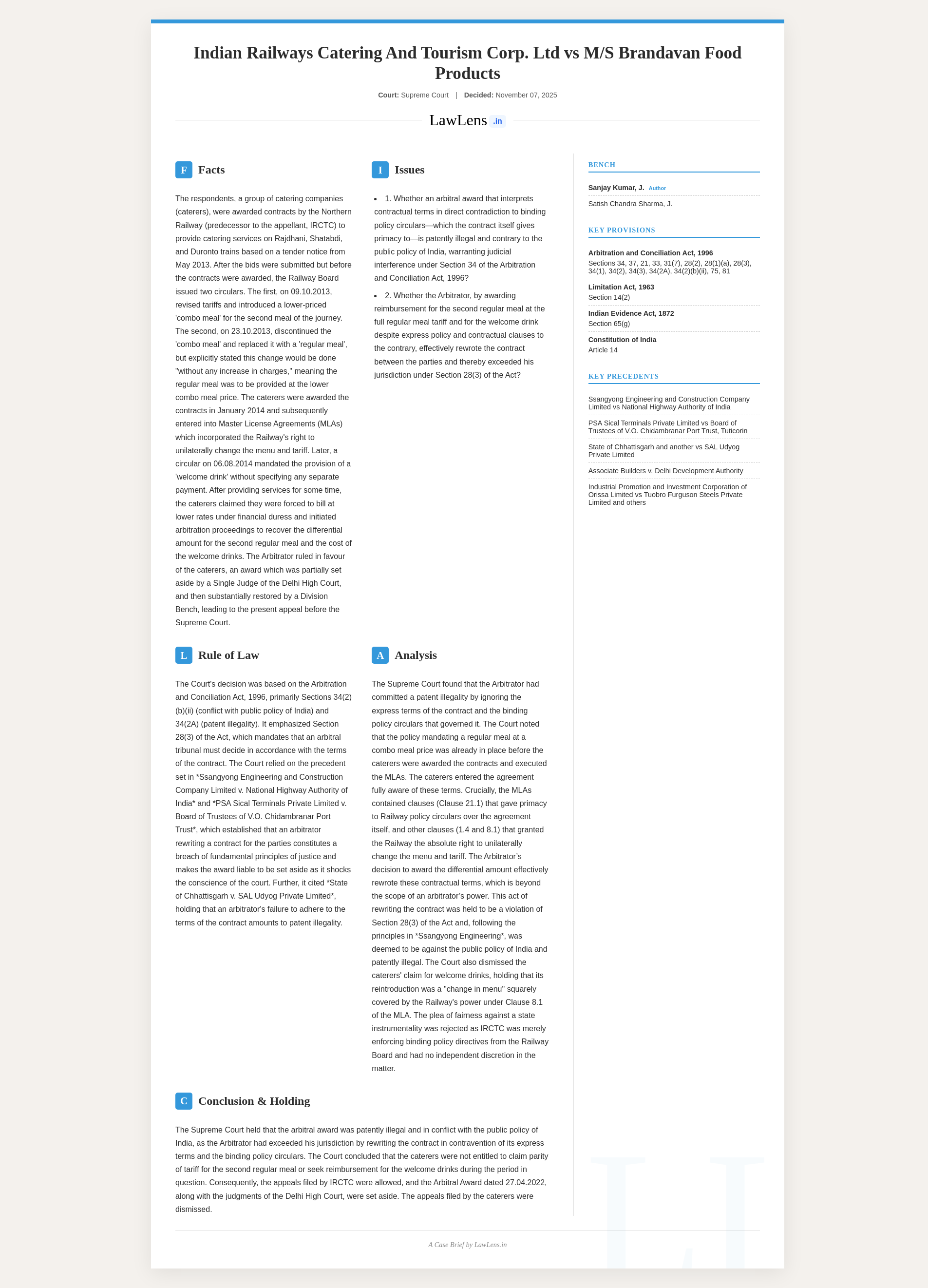 Indian Railways Catering and Tourism Corp. Ltd vs Brandavan Food Products; 2025 INSC 1294 - S.34 Arbitration Act - Rewriting Contract