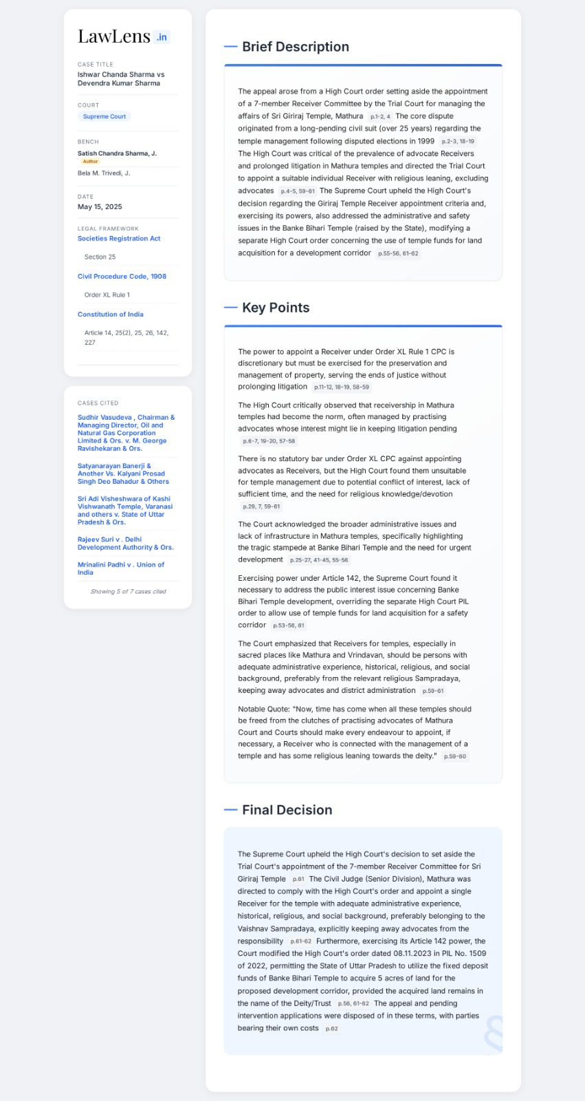 Ishwar Chanda Sharma vs Devendra Kumar Sharma 2025 INSC 700 - Mathura Temple Matters