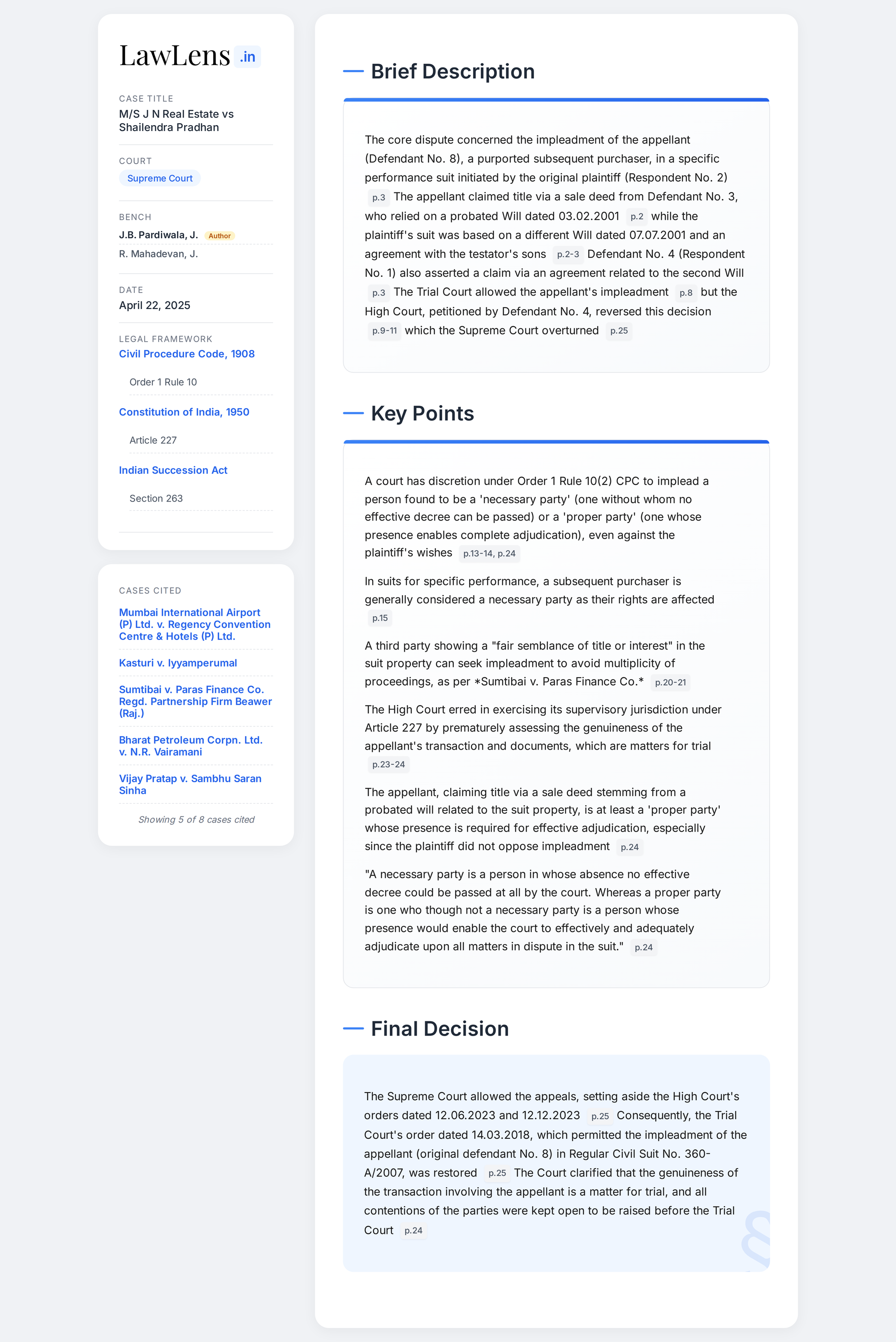 J N Real Estate vs Shailendra Pradhan 2025 INSC 611 -Order I Rule 10(2) CPC - Impleadment