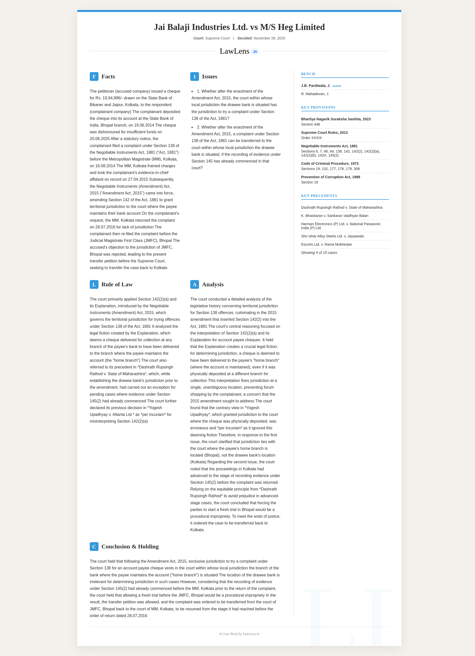 Jai Balaji Industries Ltd. v. M/s HEG Ltd.; 2025 INSC 1362 - Cheque Bounce Case - Jurisdiction Of Courts