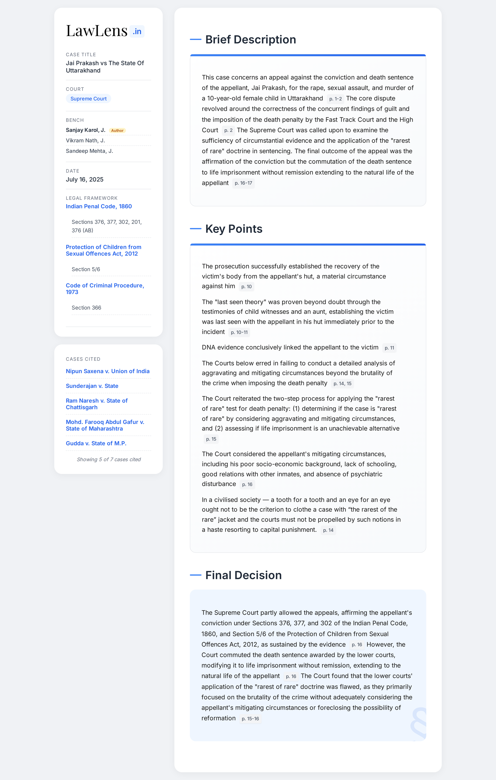 Jai Prakash Vs State Of Uttarakhand 2025 INSC 861 - Death Sentence Commuted - Minor's Rape And Murder Case