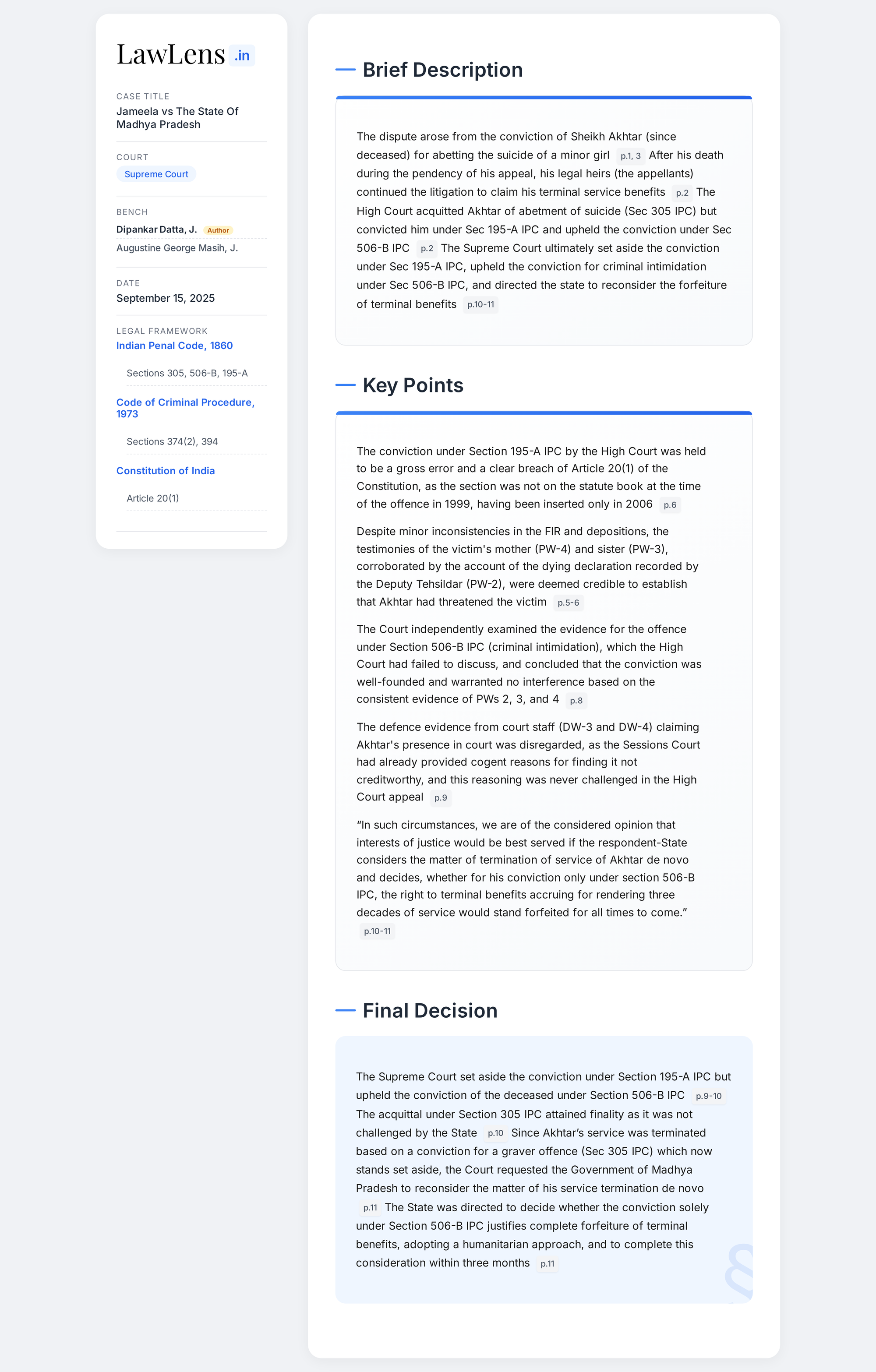 Jameela vs State of Madhya Pradesh 2025 INSC 1121 - Art.20 Constitution - S.195A IPC