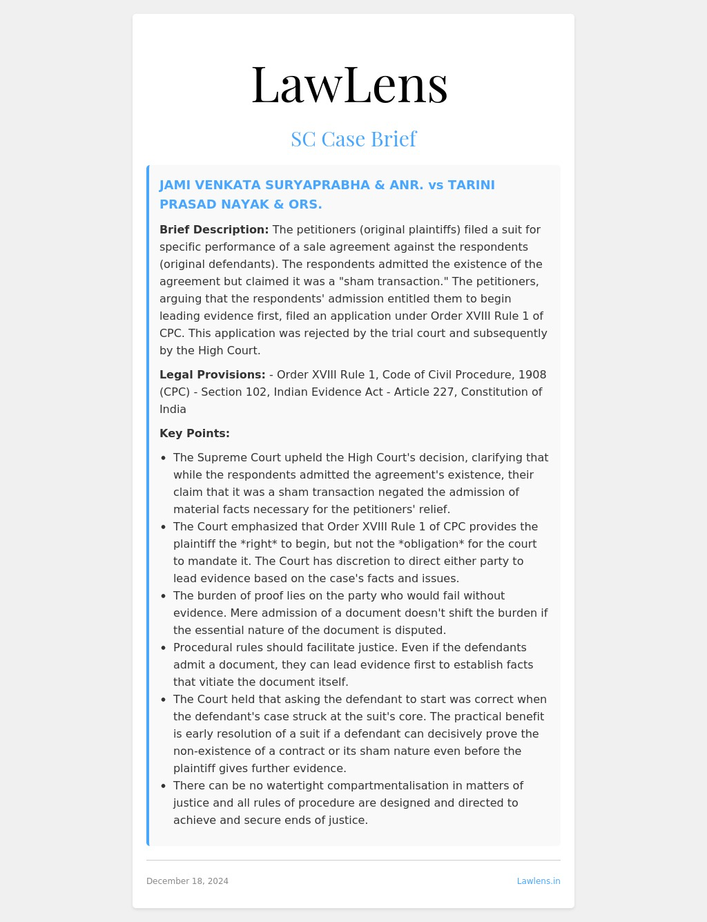 Code Of Civil Procedure 1908 - Order XVIII Rule 1 - As a general rule, according to the procedural law, it is the plaintiff who has to prove his claim by positive proof, for the court has to see whether there is a proof of claim before it needs to enquire, as to the truth or otherwise of the defence. It is open to the plaintiff to say that although he has the right to begin, yet he may rest content with relying upon the averments made in the written statement. Yet evidence need not always be led by the party who has the right to begin and on whom lies the burden of proof; it is open to him to sustain the onus by facts which he may elicit in cross examination of the other party or his witnesses. In order to come to the conclusion, concerning on whom the legal burden of proof rests, in addition to the substantive law, the pleadings of the parties coupled with documents that they produced & the admissions, if any concerning such documents have to be taken into account. (Para 11) Where the defendant admits the facts alleged by the plaintiff but contends that the plaintiff is not entitled to any part of the relief which he seeks, it is the defendant who gets the right to begin. (Para 16) Order XVIII Rule 1 indeed provides for plaintiff's right to begin the evidence but not the court's obligation to ask the plaintiffs to begin first. There is no impediment for the court to call upon either party to lead evidence first, depending upon the facts and circumstances of the case and the nature of the issues framed. Neither party can insist that the other one should be asked to lead it first. It all depends upon what the Court deems proper in the circumstances. Where it finds that defendant's plea strikes of the root of the case, there would be no hitch in asking him/her to prove such plea first which can lead to disposal of the case. There can be no watertight compartmentalisation in matters of justice and all rules of procedure are designed and directed to achieve and secure ends of justice. (Para 18)