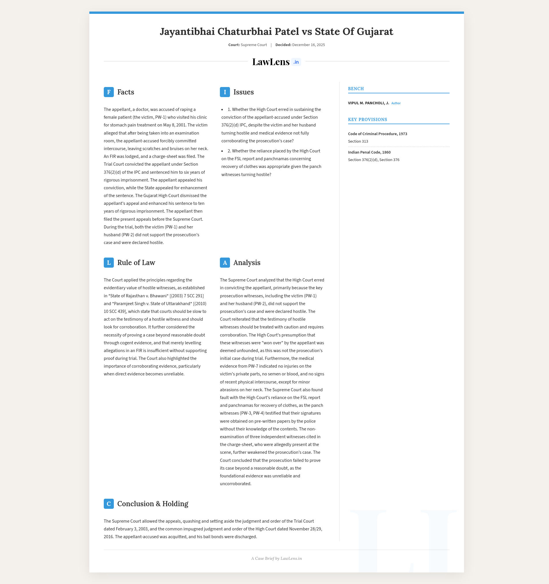 Jayantibhai Chaturbhai Patel v. State of Gujarat; 2025 INSC 1443 - Rape Victim Turned Hostile