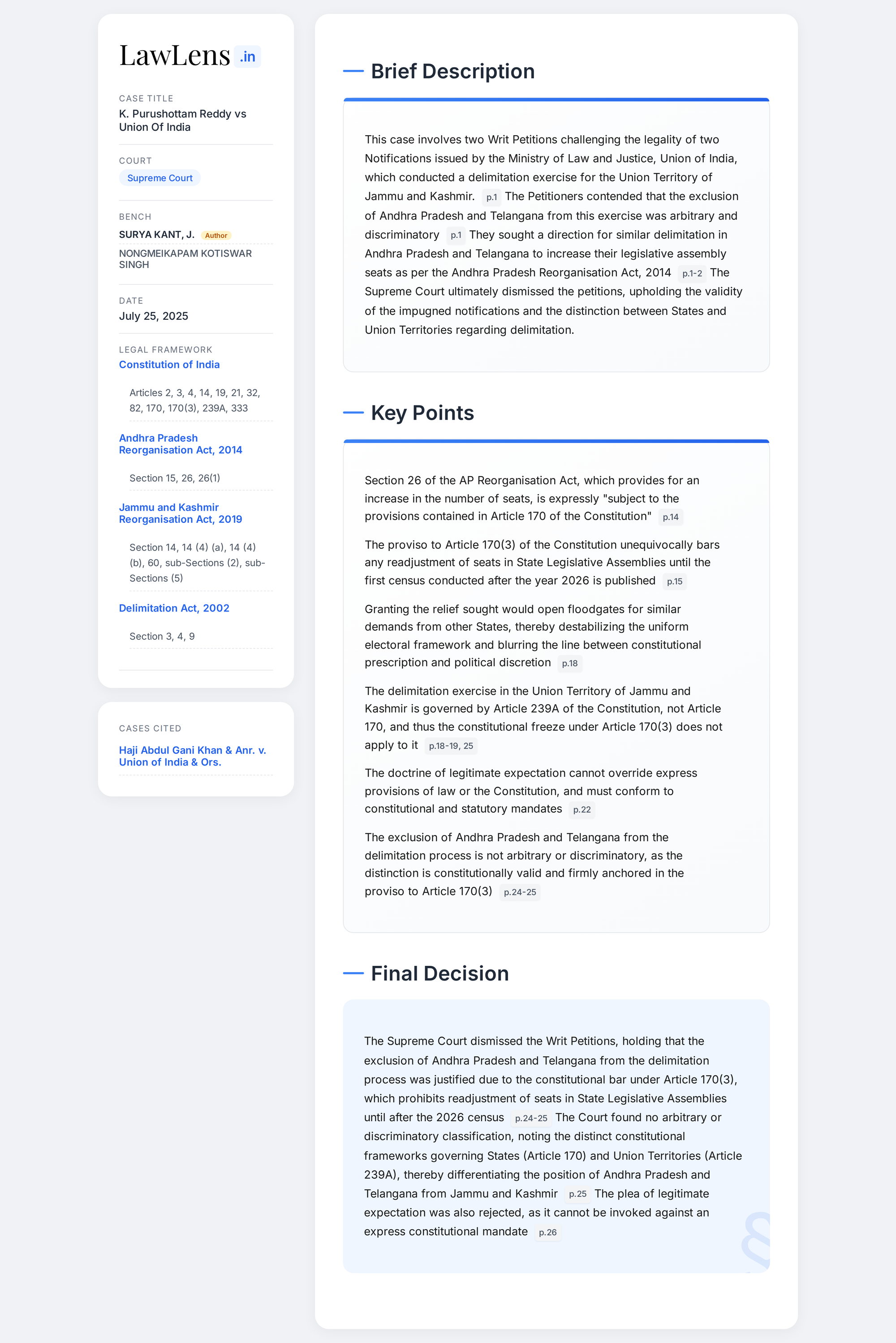 K. Purushottam Reddy vs. Union of India 2025 INSC 894 - Delimitation Notification - Andhra Pradesh - Art.170 Constitution