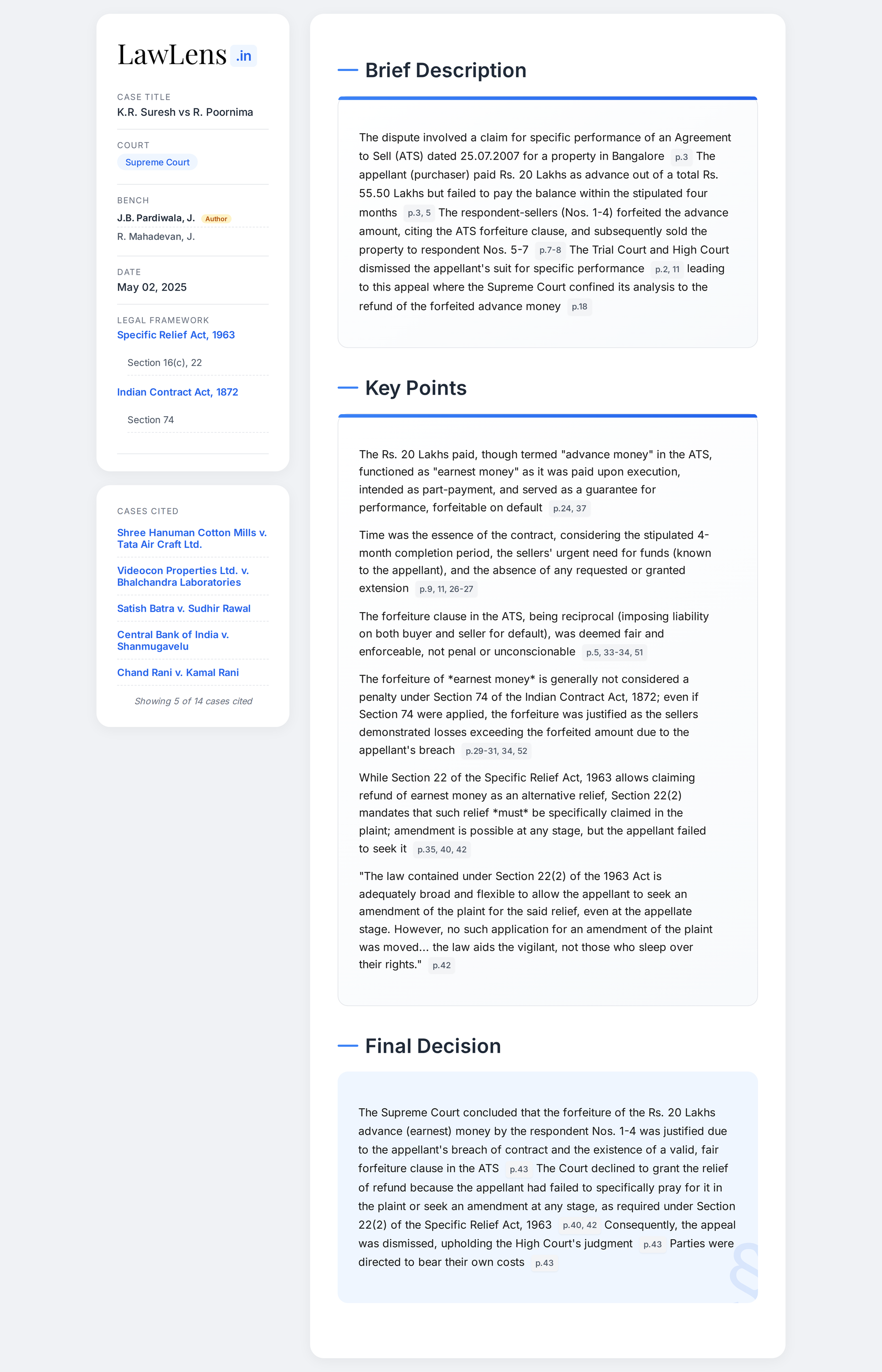 K.R. Suresh vs R. Poornima 2025 INSC 617 -S. 22 Specific Relief Act - Earned