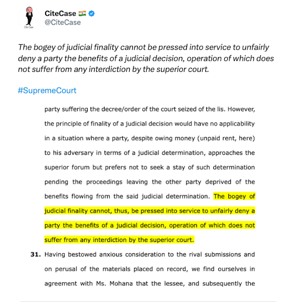 The bogey of judicial finality cannot be pressed into service to unfairly deny a party the benefits of a judicial decision, operation of which does not suffer from any interdiction by the superior court.#SupremeCourt https://t.co/OtoQ0SFrnJ pic.twitter.com/N1SPkLEM0g