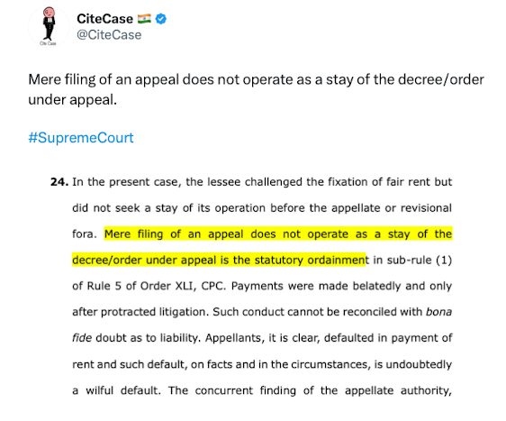 Mere filing of an appeal does not operate as a stay of the decree/order under appeal.#SupremeCourt https://t.co/OtoQ0SFrnJ pic.twitter.com/29aJg13Cmx