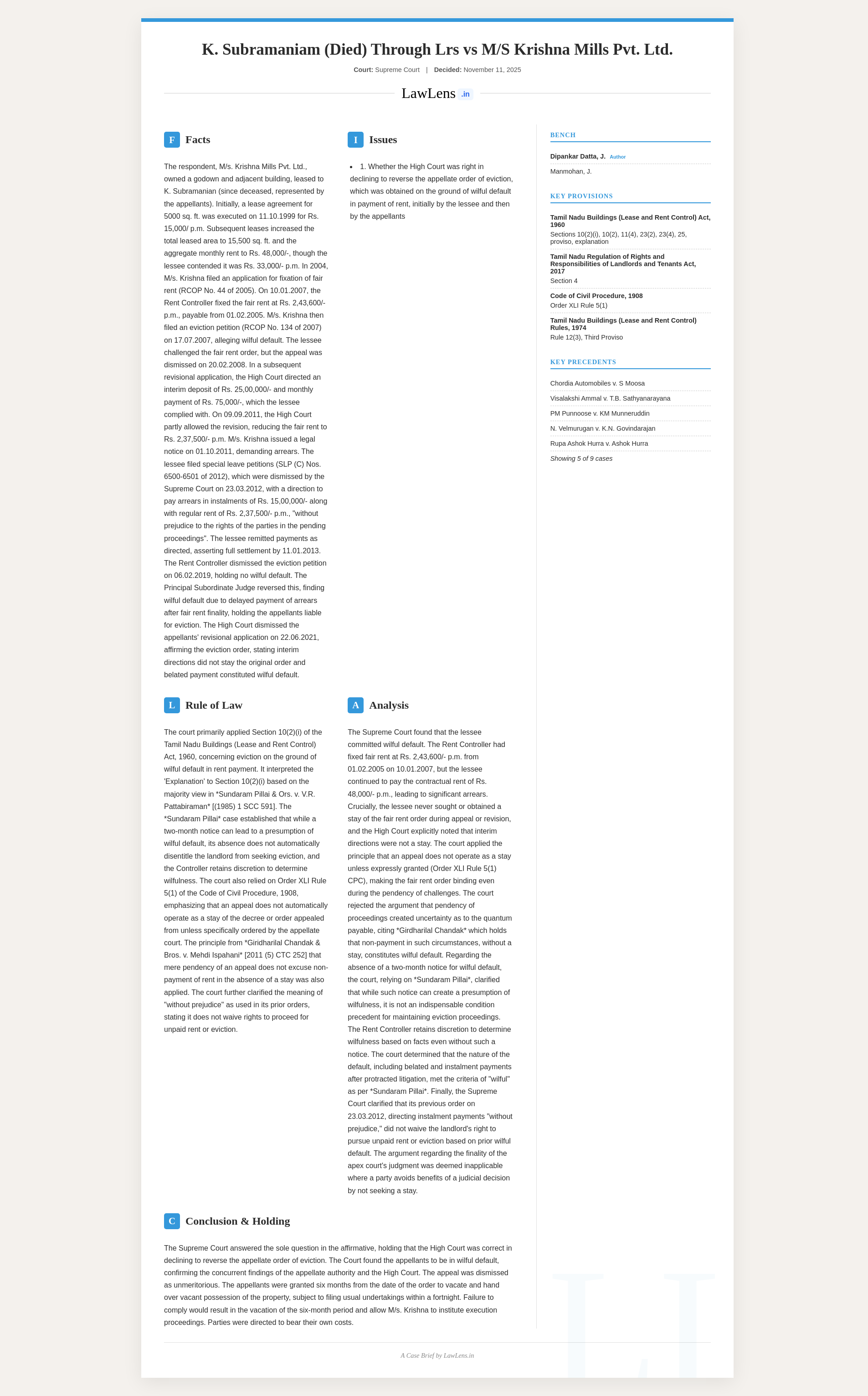 - Case name: K. Subramaniam (Died) Through LRs K.S. Balakrishnan & Ors. v. M/s Krishna Mills Pvt. Ltd.