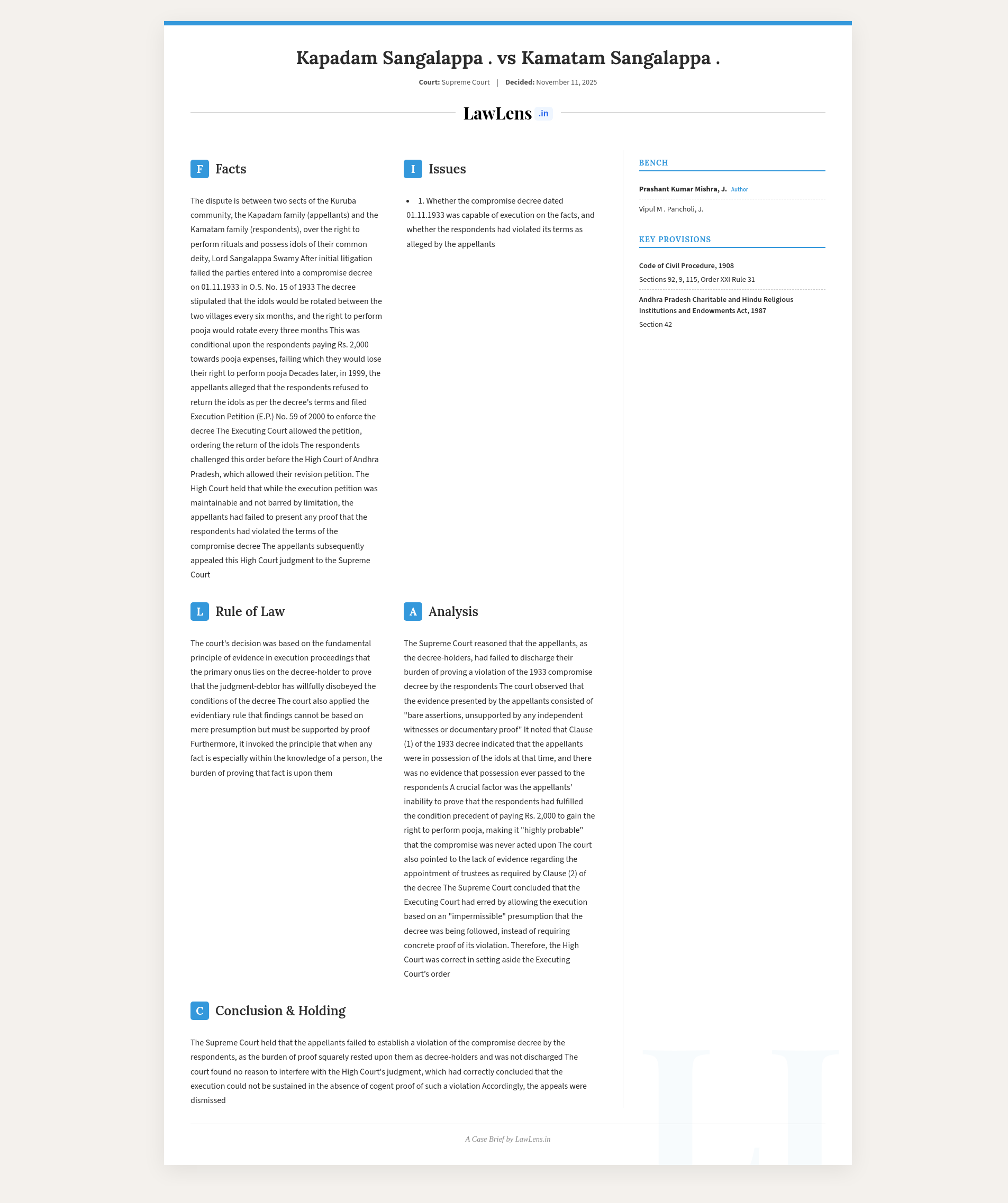 Code of Civil Procedure 1908 - Order XXI - Execution - In execution petition, the primary onus lies on the decree-holder to show that the judgment debtor has willfully disobeyed the conditions of the decree. (Para 26) - The burden of proving violation of the decree rests squarely on the decree-holders. In the absence of cogent proof of such violation, the execution cannot be sustained. (Para 28) [Context: SC held that Executing Court fell into an error in allowing the execution of the compromise decree on mere presumption without any proof]