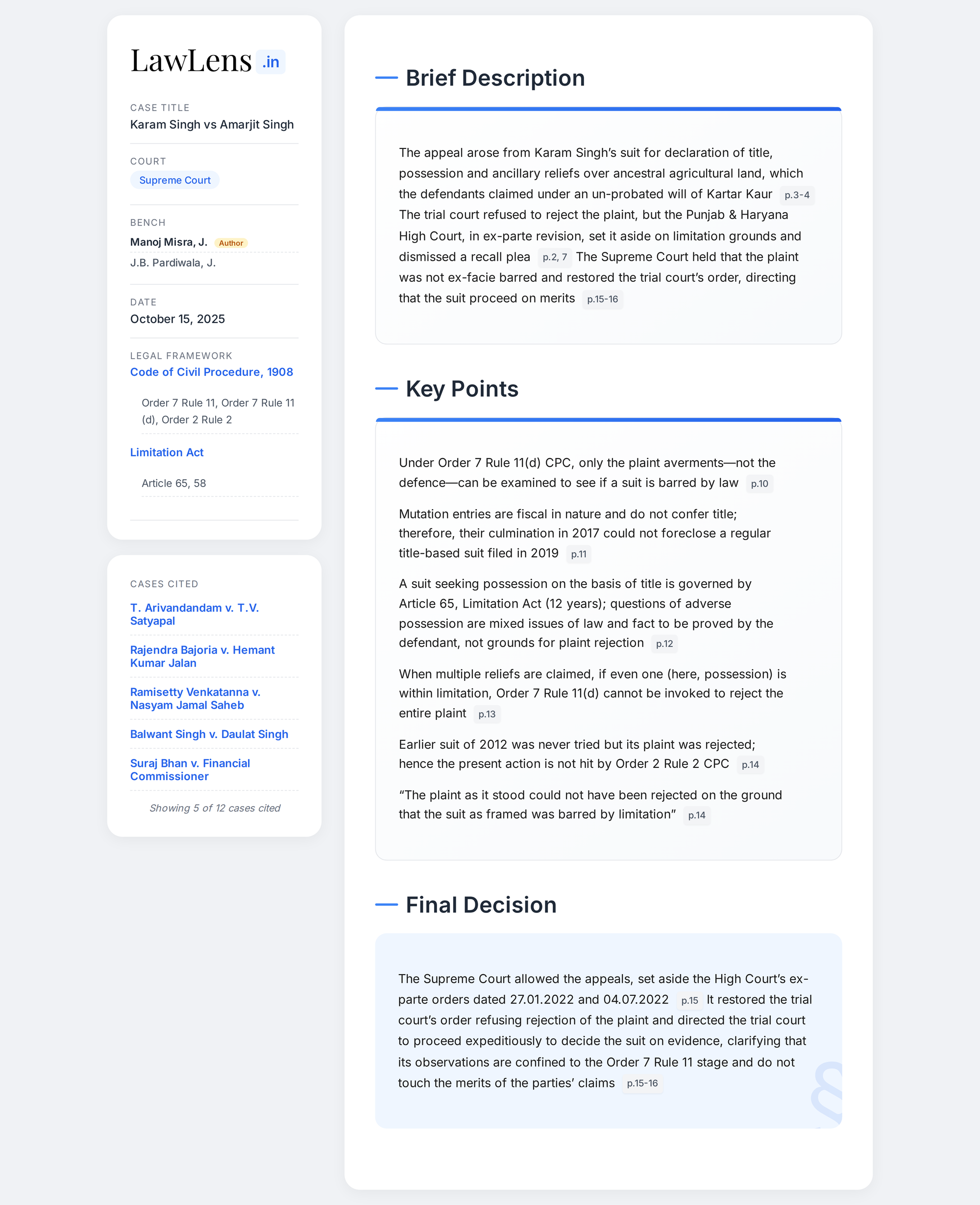 Karam Singh v. Amarjit Singh 2025 INSC 1238 - CPC - Rejection Of Plaint - Adverse Possession - Revenue Records