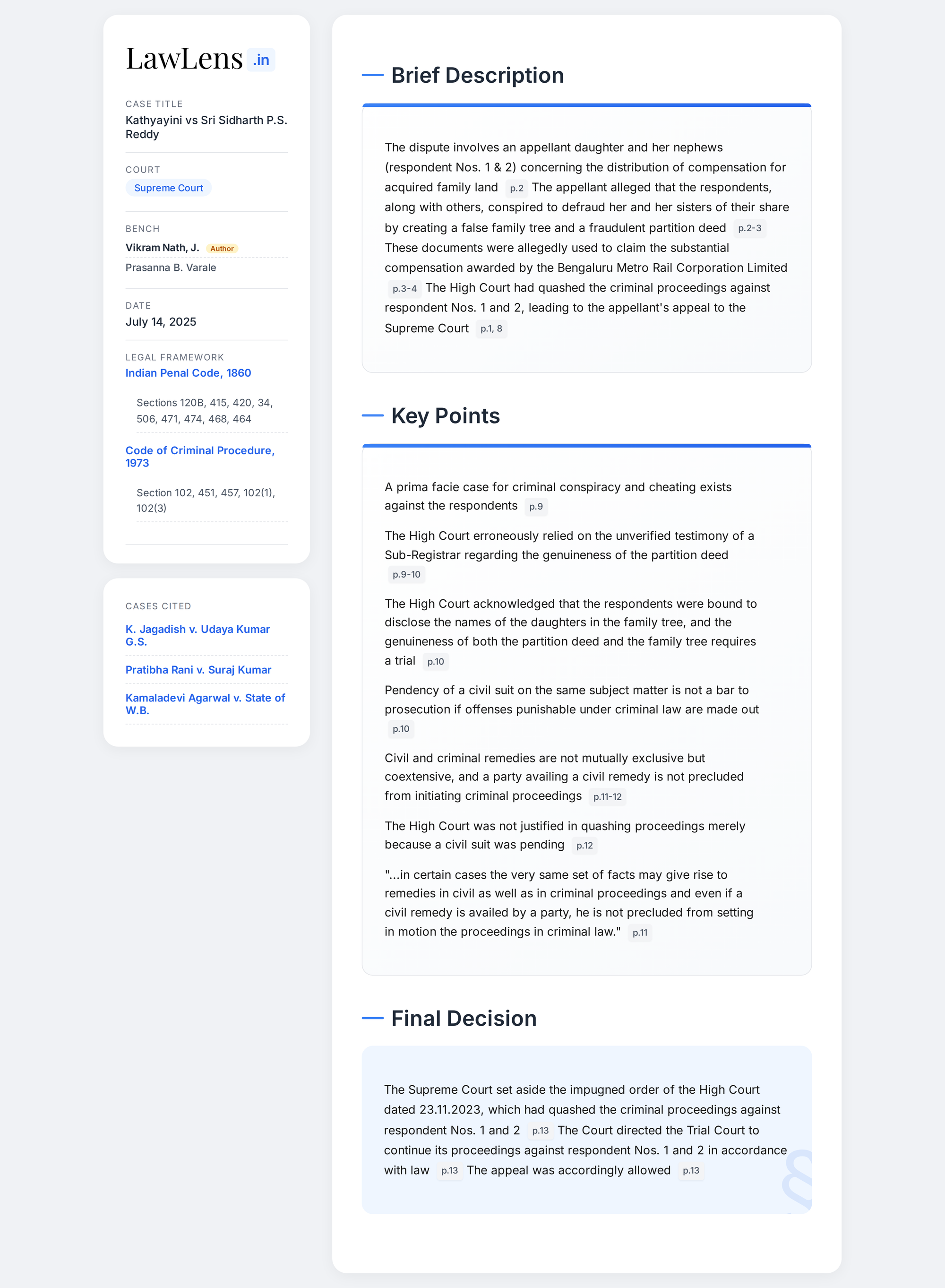 Kathyayini vs Sidharth P.S. Reddy 2025 INSC 818 - S.482 CrPC - Pendency Civil Proceedings