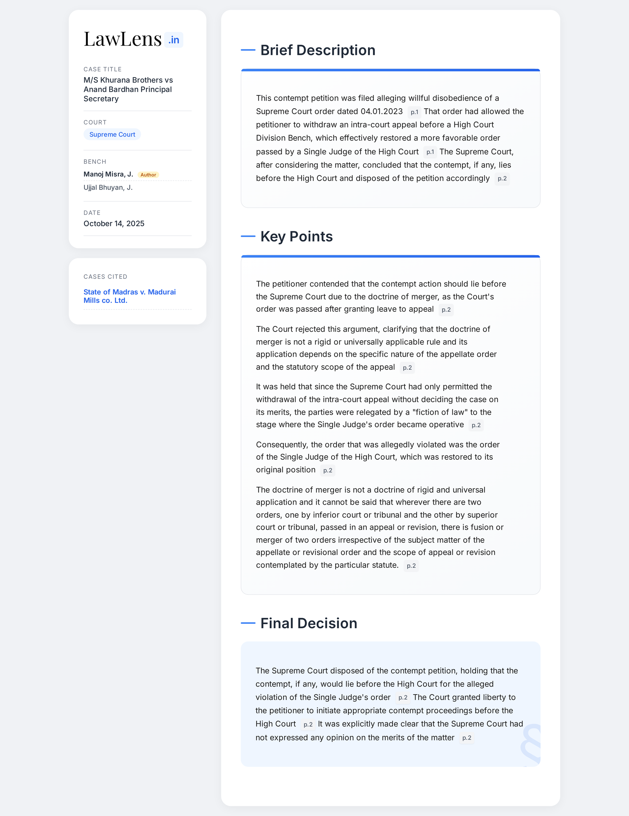 Khurana Brothers vs Anand Bardhan Principal Secretary 2025 INSC 1240-Doctrine of Merger