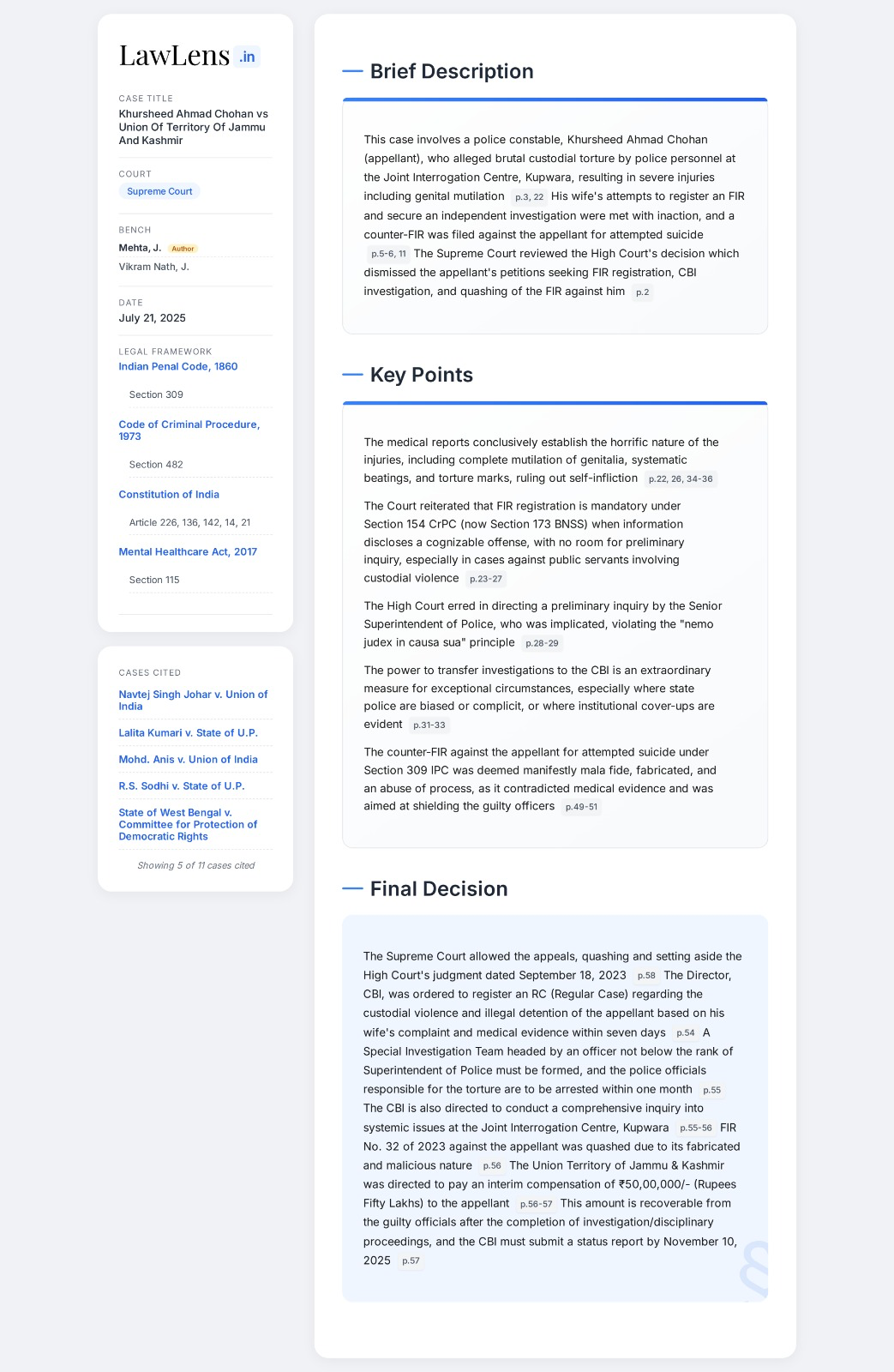 Khursheed Ahmad Chohan vs Union Of Territory Of Jammu And Kashmir 2025 INSC 876 - Custodial Violence - FIR - CBI Investigation