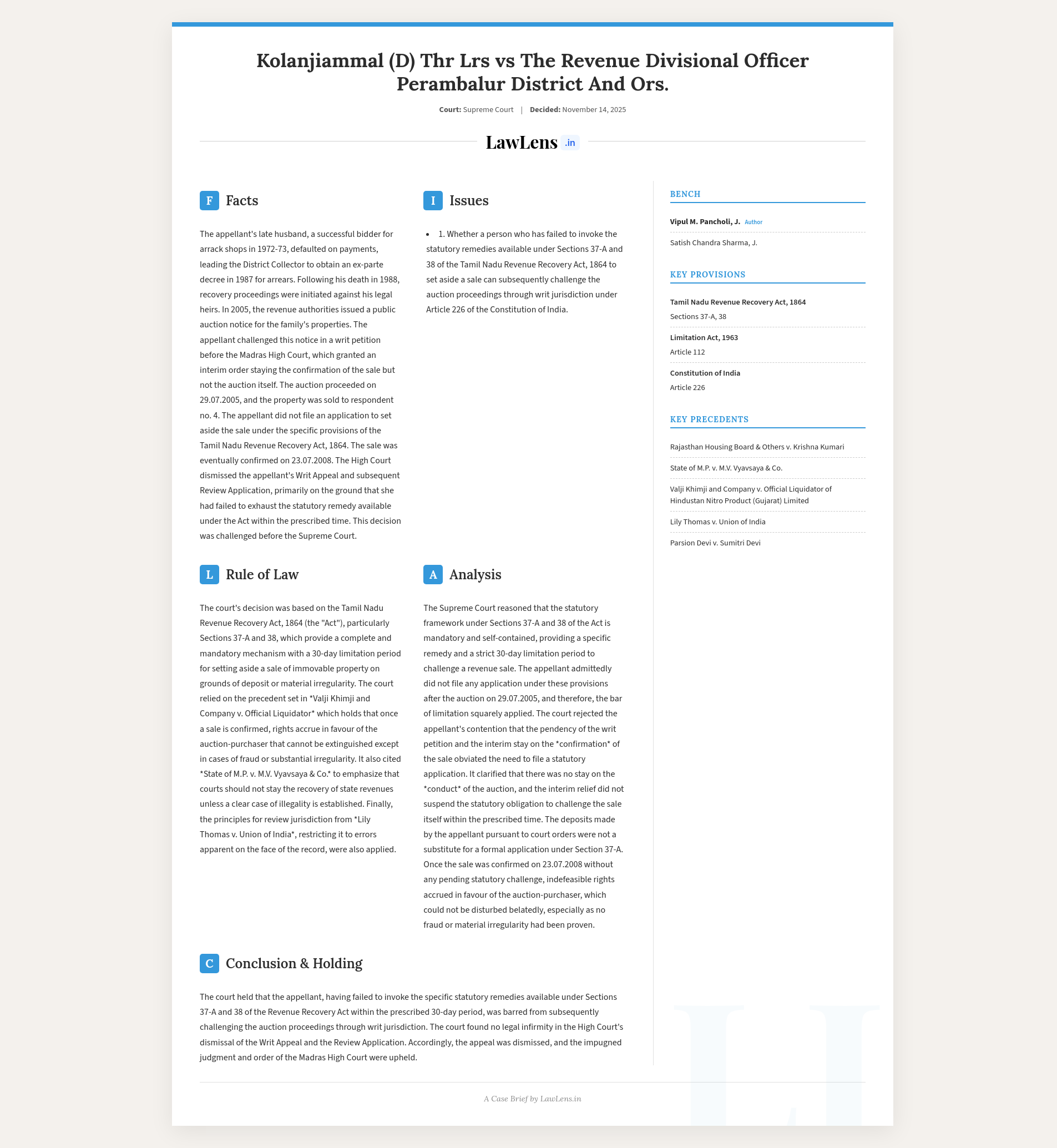 Kolanjiammal (D) Thr LRs v. Revenue Divisional Officer, Perambalur 2025 INSC 1319 - Revenue Recovery - Auction - Review Powers