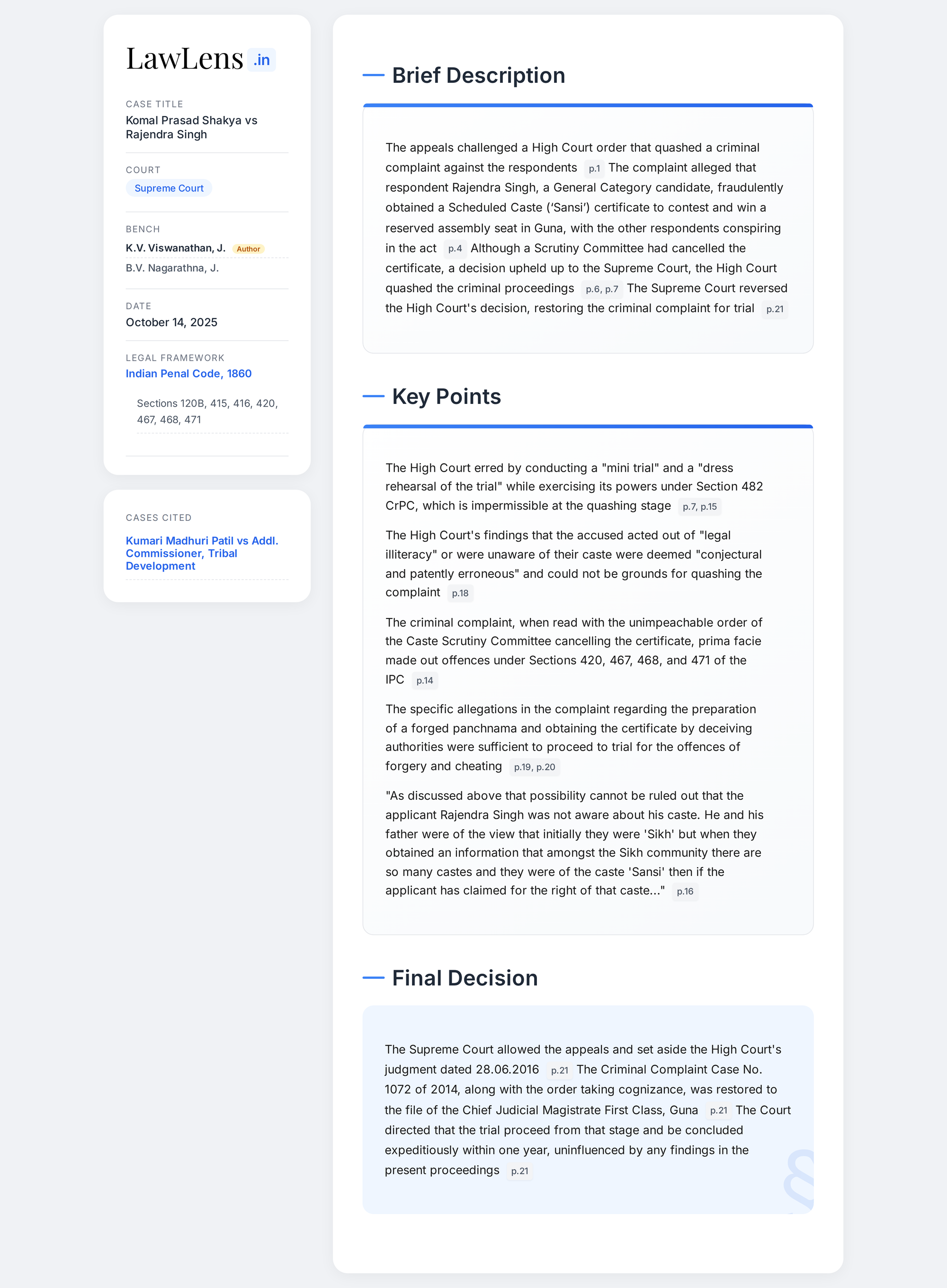- Kumari Madhuri Patil and Another v. Addl. Commissioner, Tribal Development and Others, (1994) 6 SCC 241 — relied on for prosecution when social status/caste certificate is found false (para 13(14)).The judgment references this to support that false caste claims should trigger prosecution.