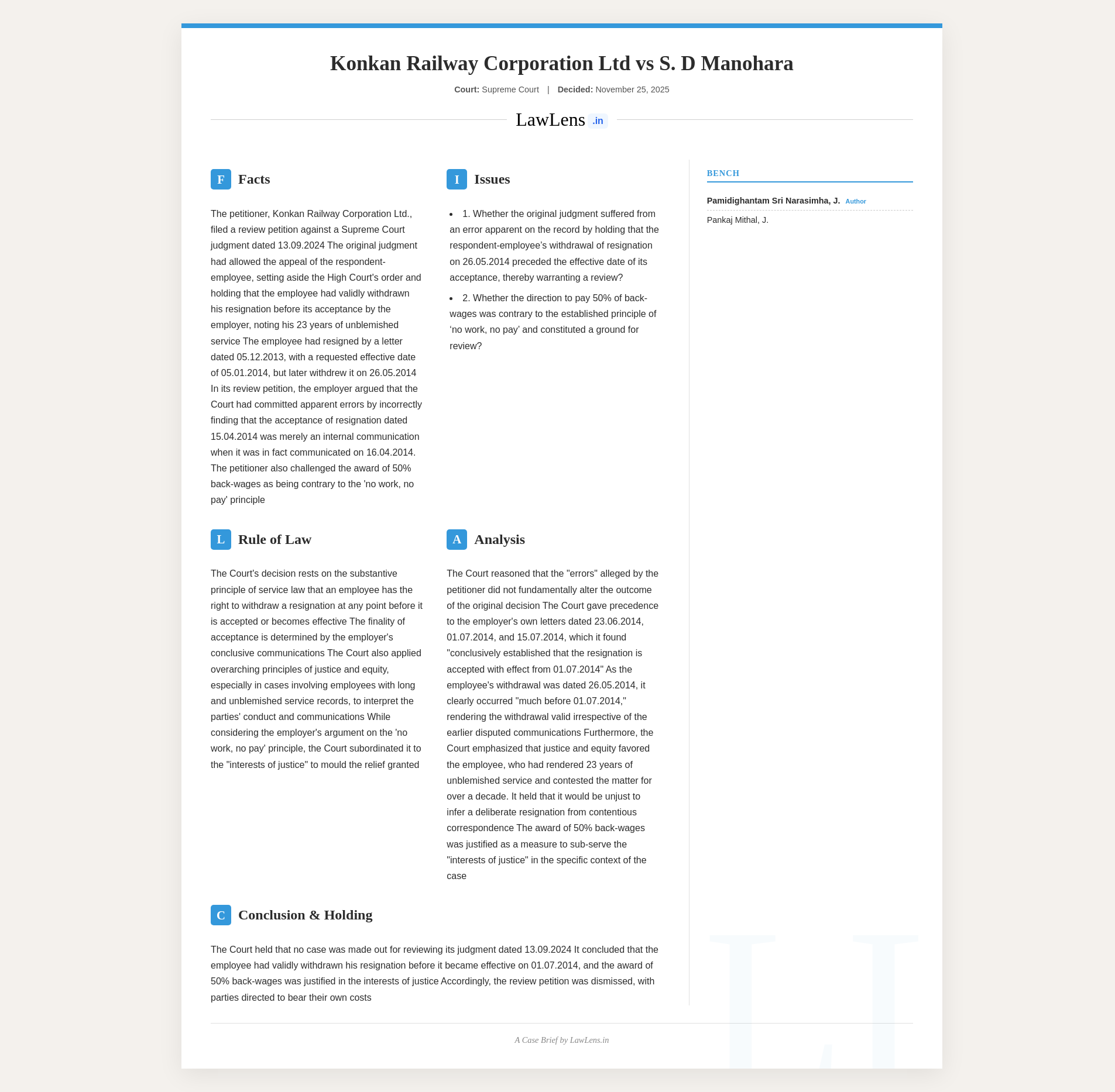 Konkan Railway Corporation Ltd. vs S.D. Manohara; 2025 INSC 1368 - Service Law - Resignation Withdrawal