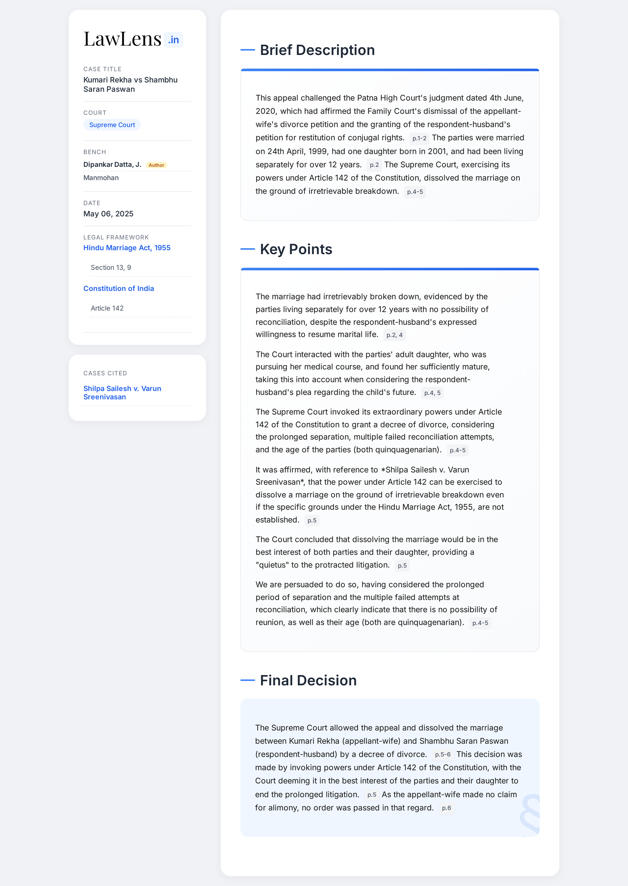 Kumari Rekha vs Shambhu Saran Paswan 2025 INSC 631 - Art. 142 Constitution - Irretrievable Breakdown Of Marriage