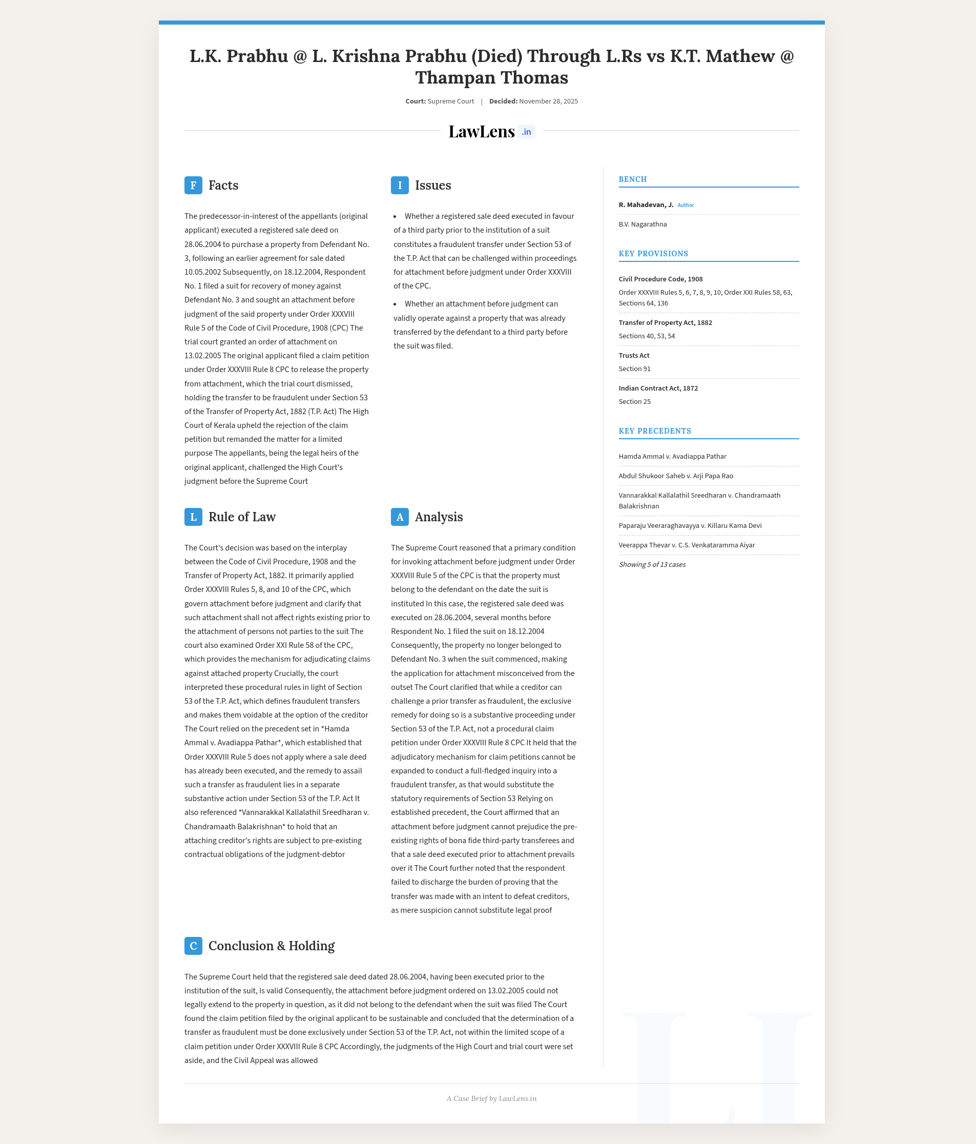L.K. Prabhu v. K.T. Mathew; 2025 INSC 1364- Order XXXVIII Rule 5 CPC - Attachment Before Judgment - Already Transferred Property