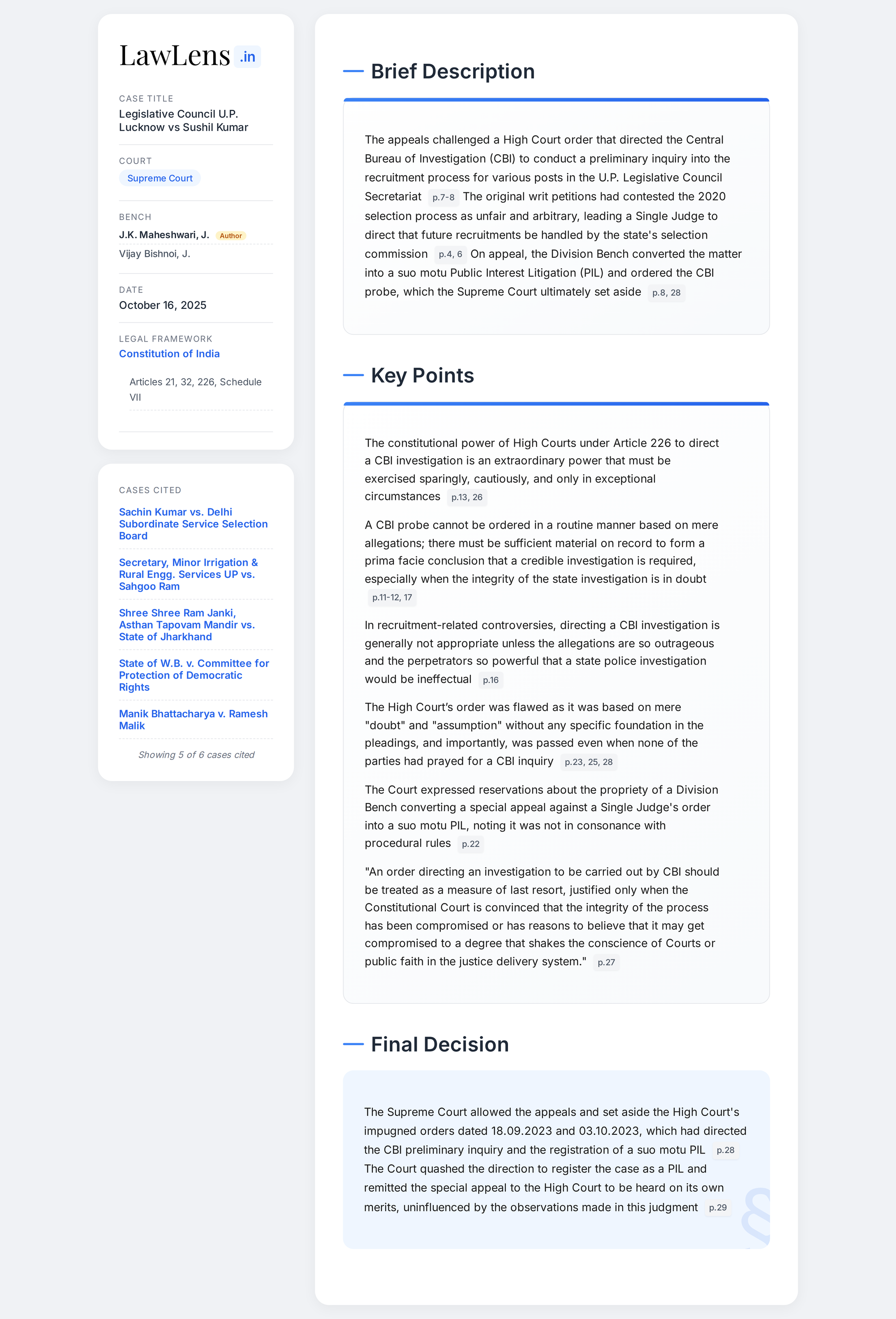 Legislative Council U.P. Lucknow vs Sushil Kumar 2025 INSC 1241 - CBI Investigation