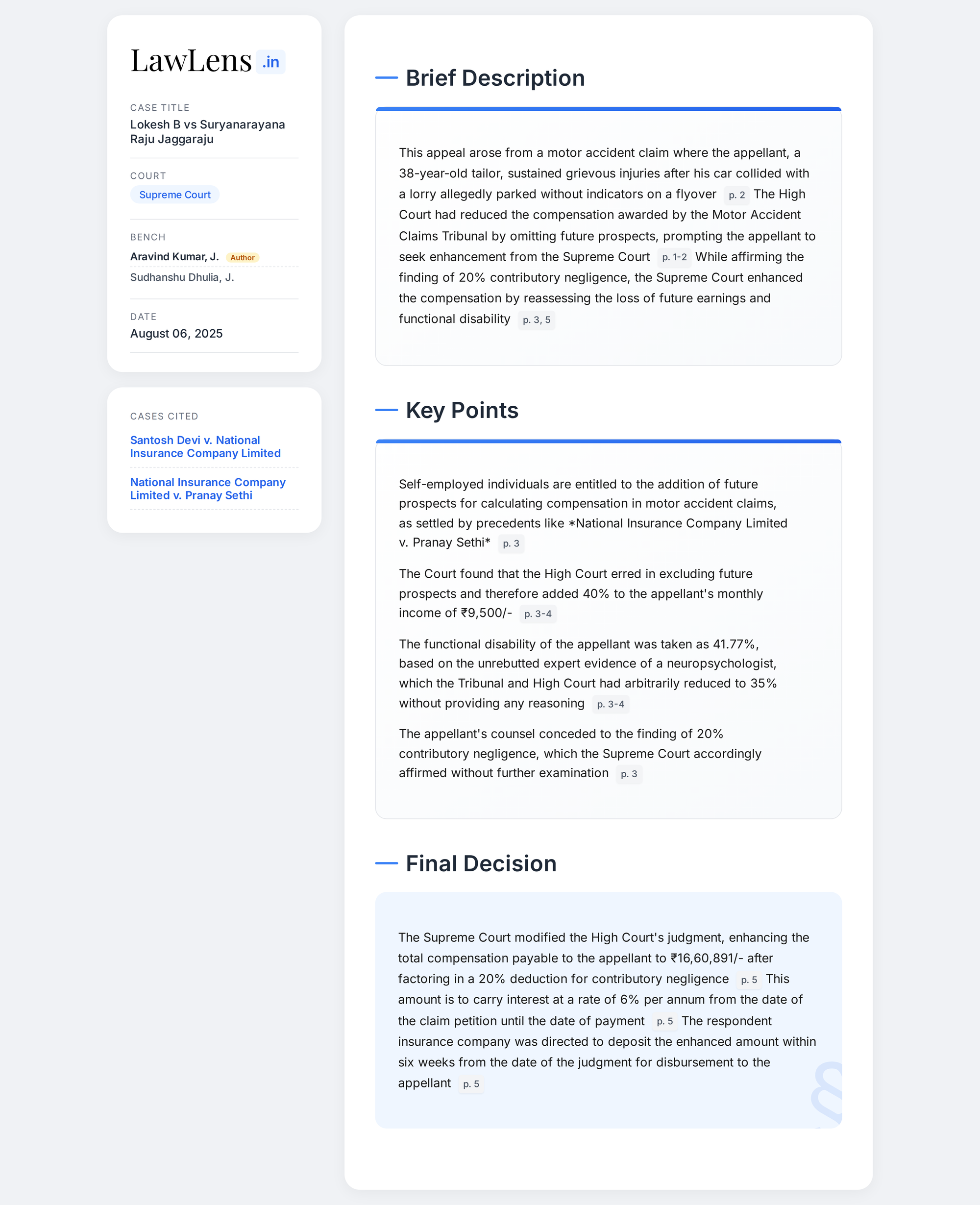 Lokesh B vs Suryanarayana Raju Jaggiraju 2025 INSC 939 - Motor Accident Compensation - Self Employed Claimant - Future Prospects