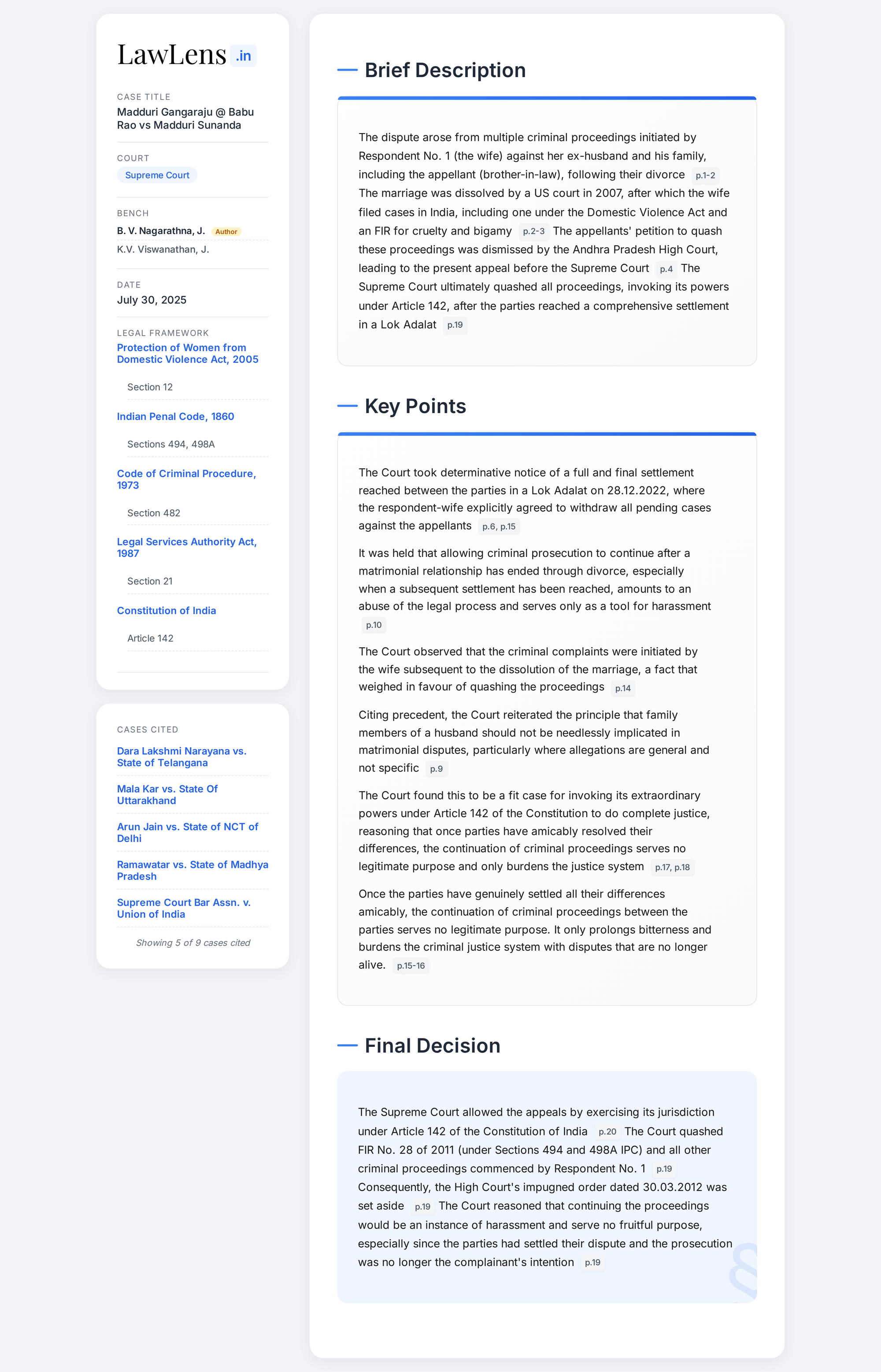 Madduri Gangaraju @ Babu Rao v. Madduri Sunanda 2025 INSC 991 - Matrimonial - Criminal Prosecutions - Settlement
