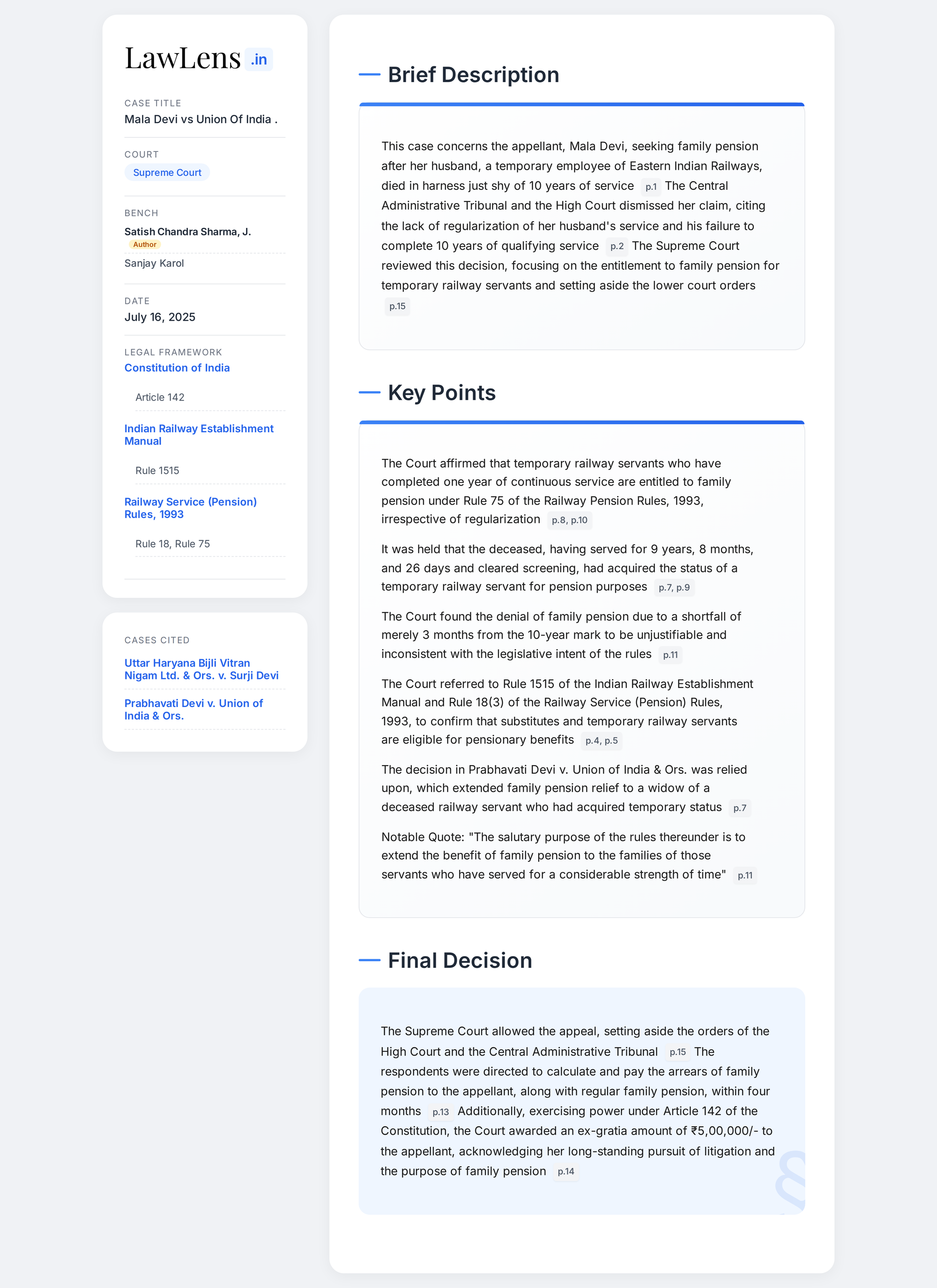 Mala Devi vs. Union of India 2025 INSC 855 - Railway Pension Rules
