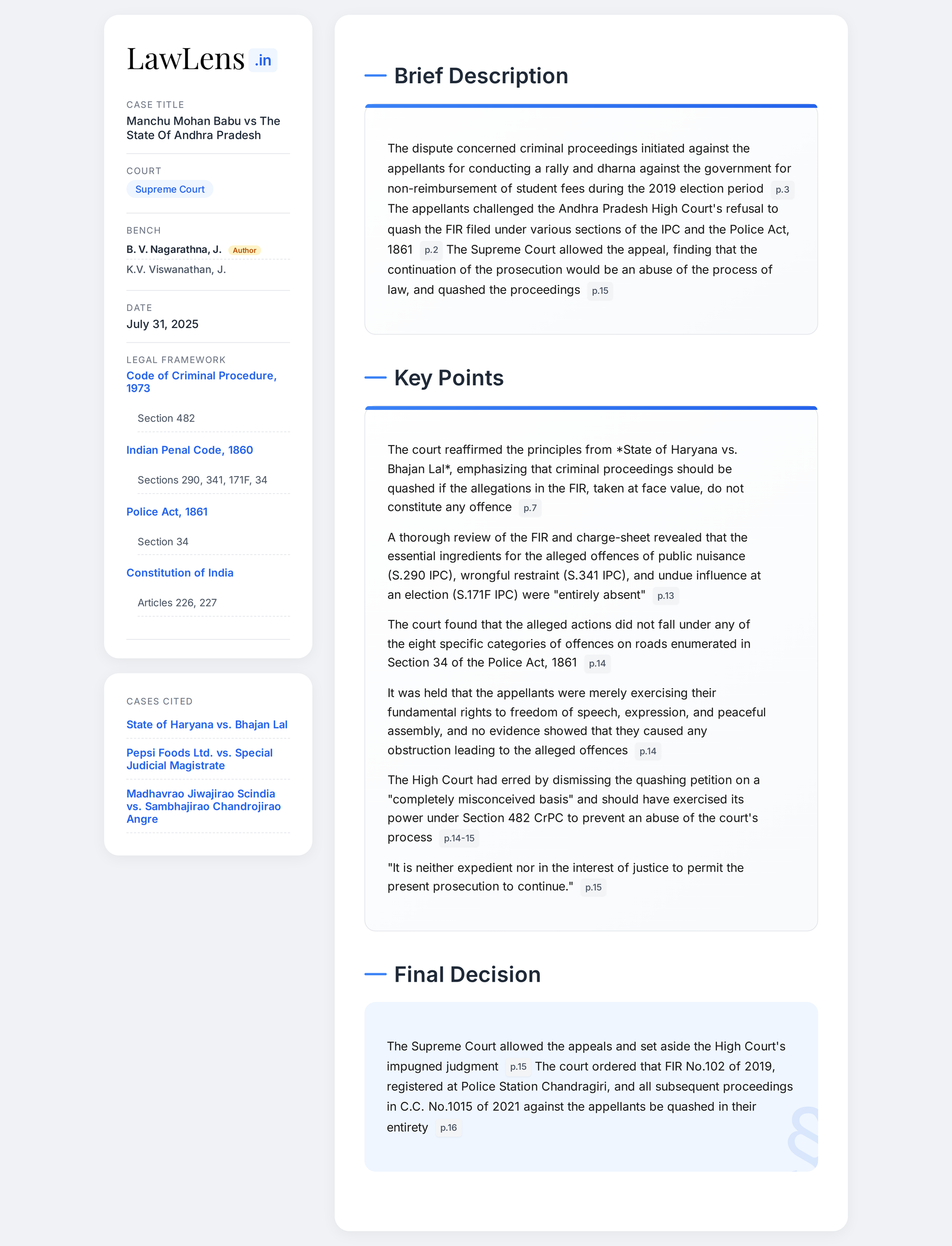- Case Name: Manchu Mohan Babu v. State of Andhra Pradesh & Another (with Manchu Vishnu Vardhan Babu v. State of Andhra Pradesh & Another)