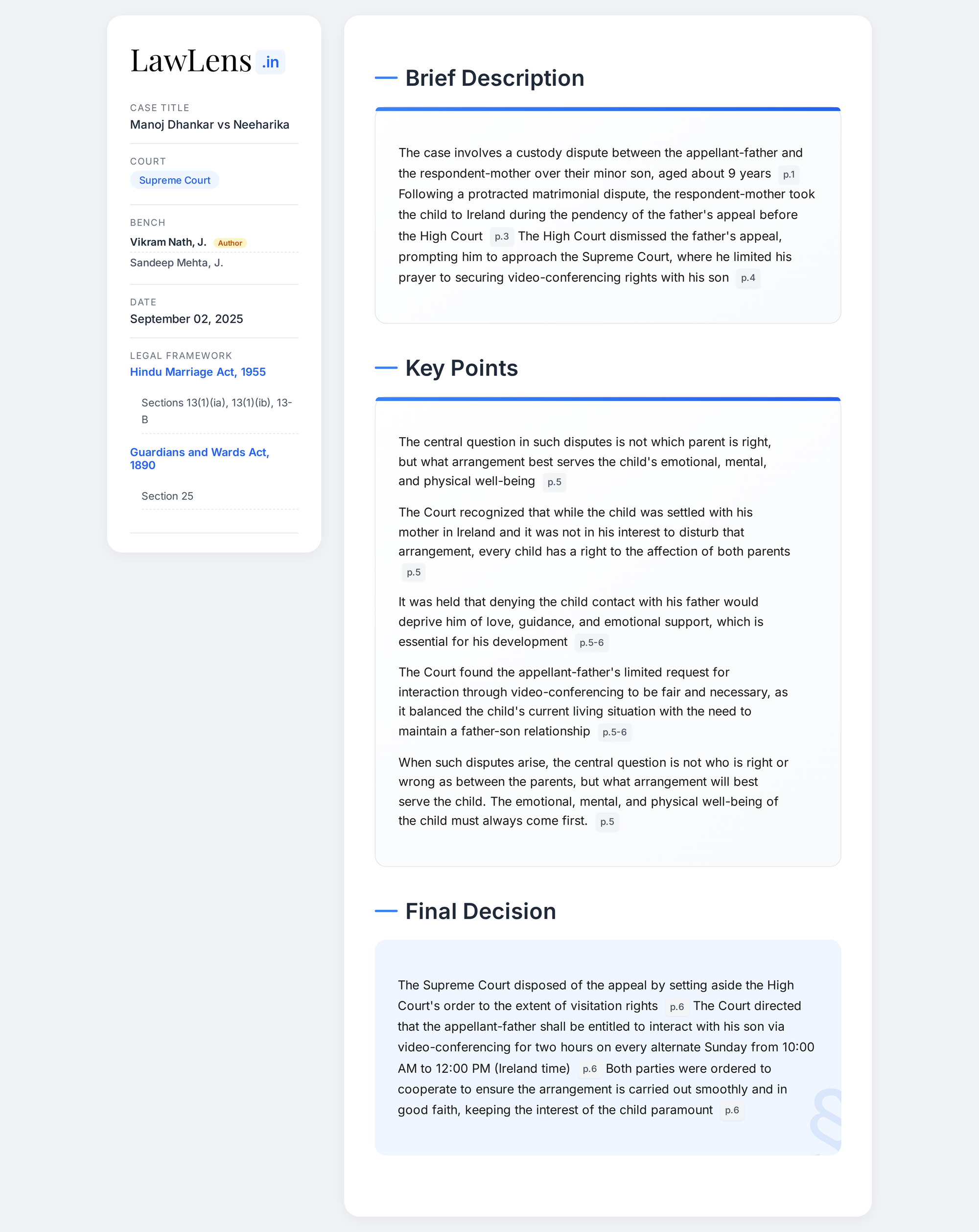 Manoj Dhankar v. Neeharika 2025 INSC 1068 - Child Custody