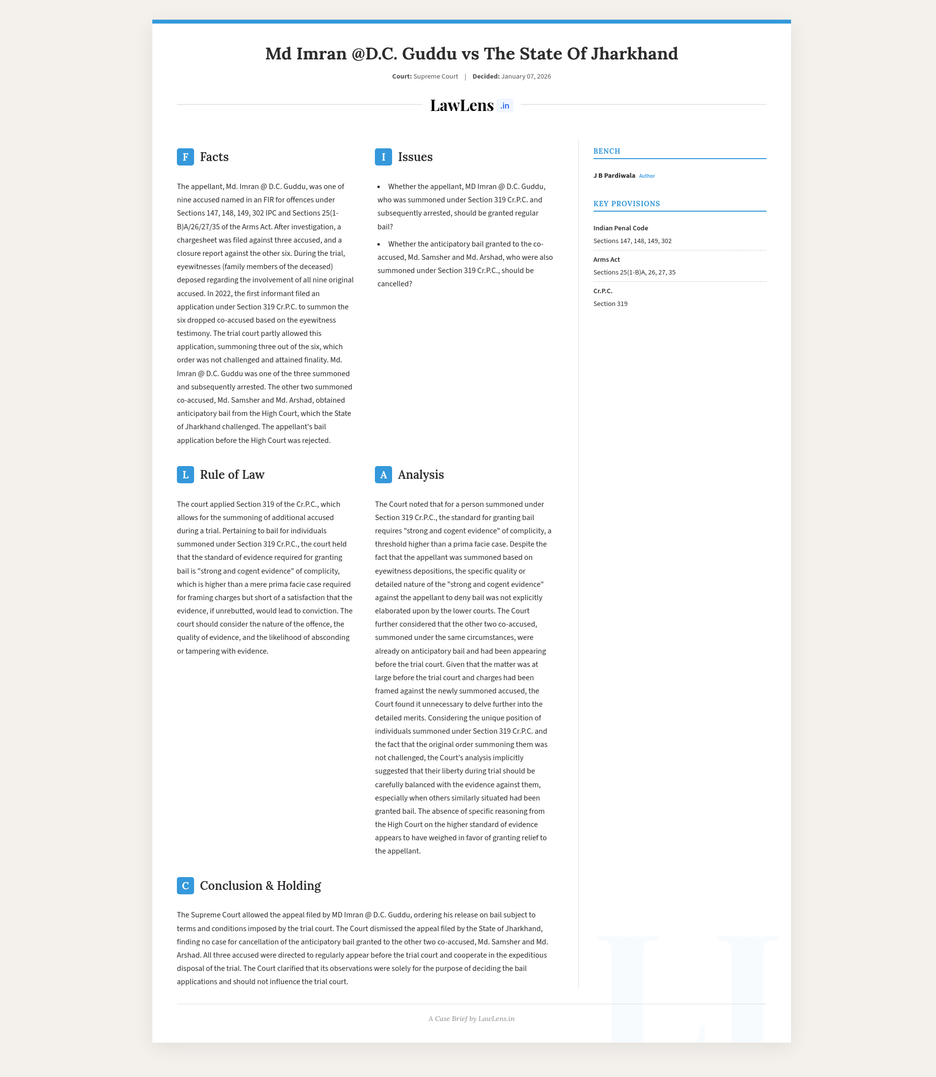 Md Imran @ D.C. Guddu v. State of Jharkhand; 2026 INSC 36 - S.319 CrPC - Bail - Tests