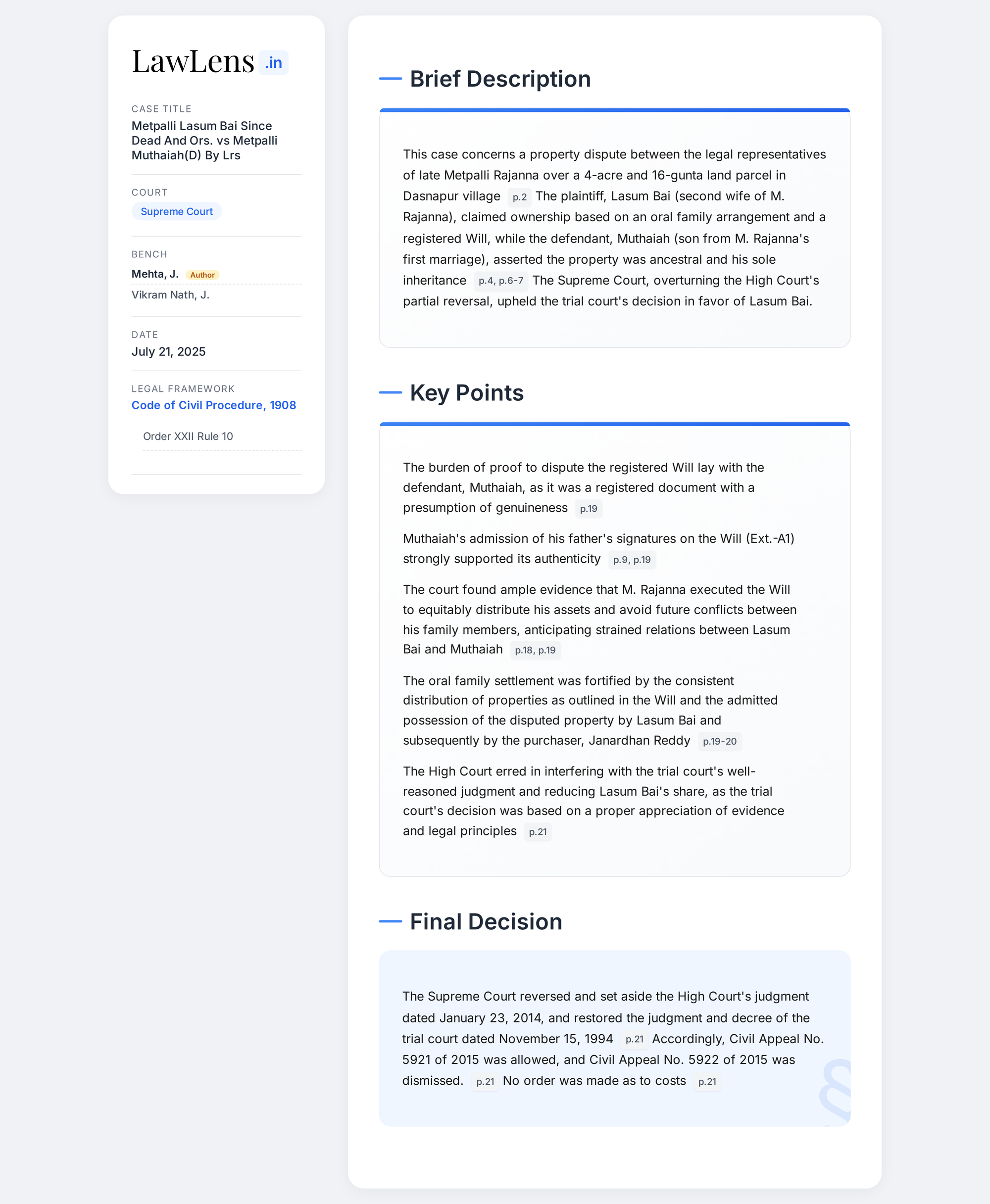 Metpalli Lasum Bai (D) vs Metapalli Muthaih(D) 2025 INSC 879 - Will - Presumption Regarding Genuineness