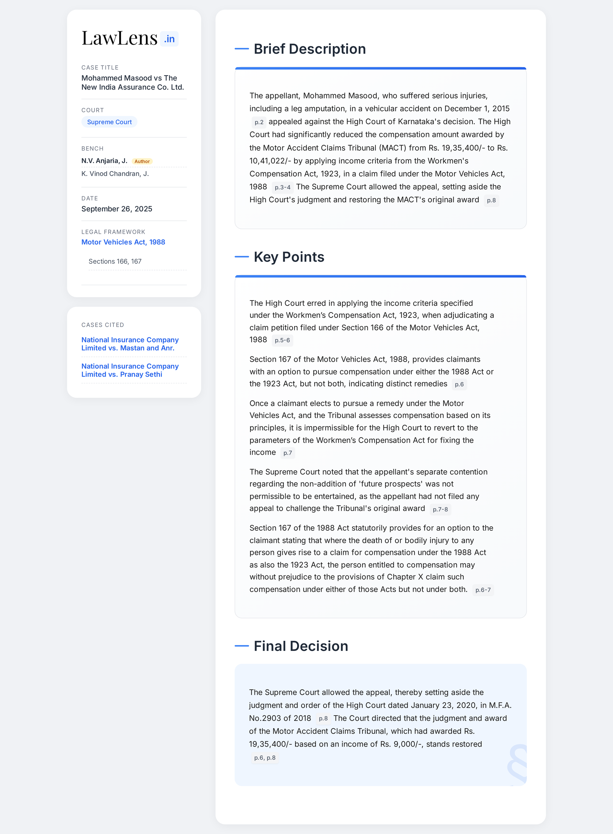 Mohammed Masood v. The New India Assurance Co. Ltd. 2025 INSC 1179 - MV Act- Employees Compensation Act
