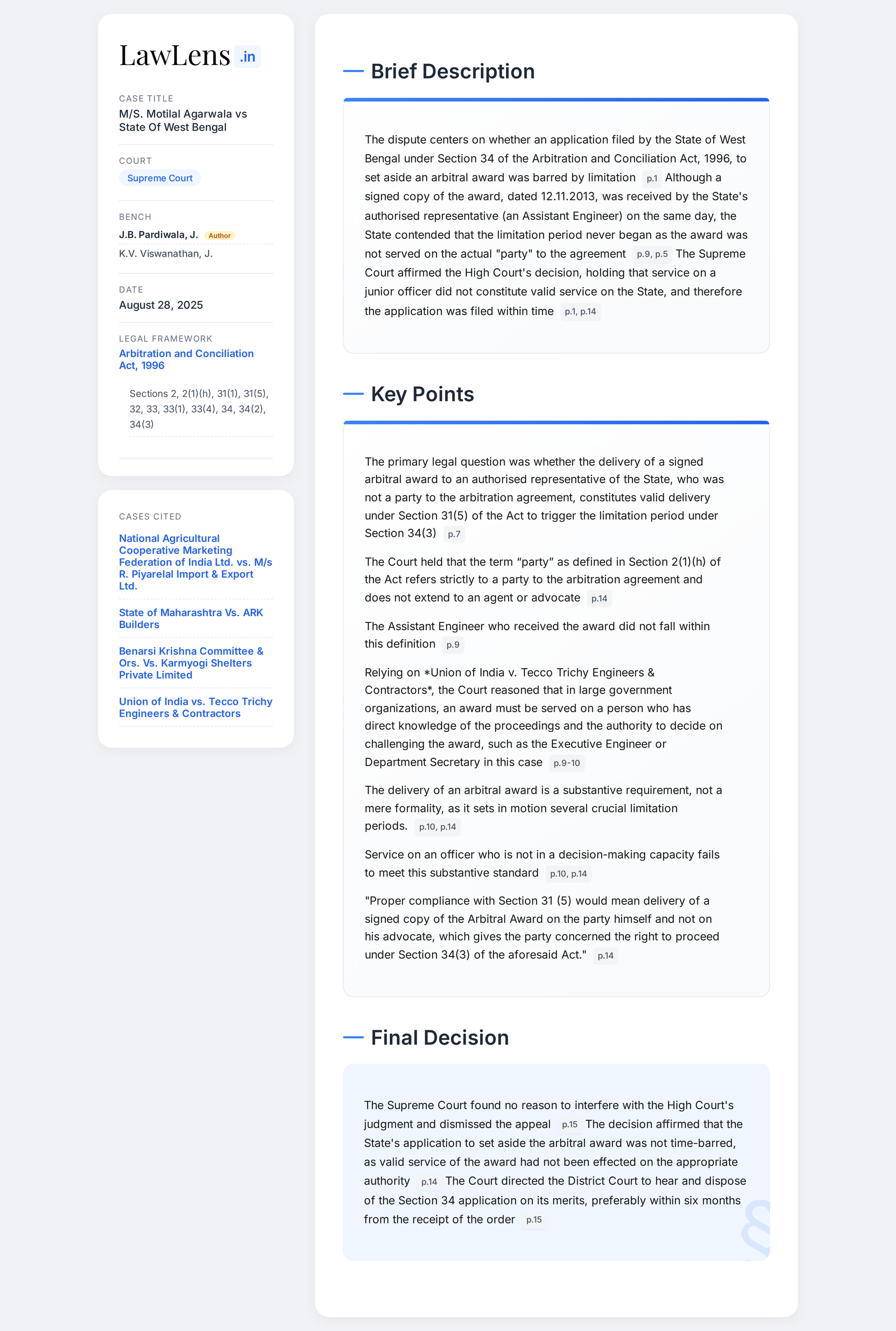 Motilal Agarwala vs State of West Bengal 2025 INSC 1062 - S.31 Arbitration Act - Delivery Of Award
