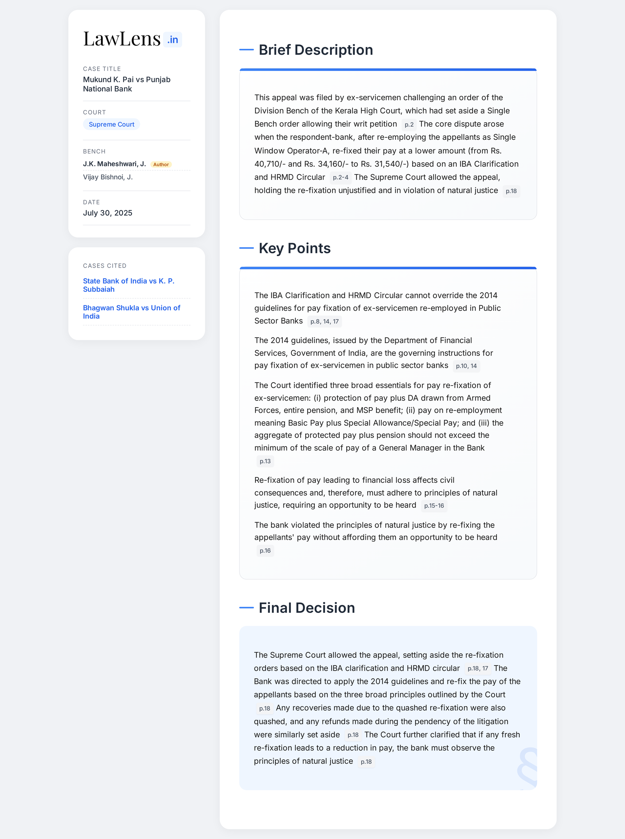 Mukund K. Pai vs Punjab National Bank 2025 INSC 1033 - Service Law - Re-Fixation Of Pay