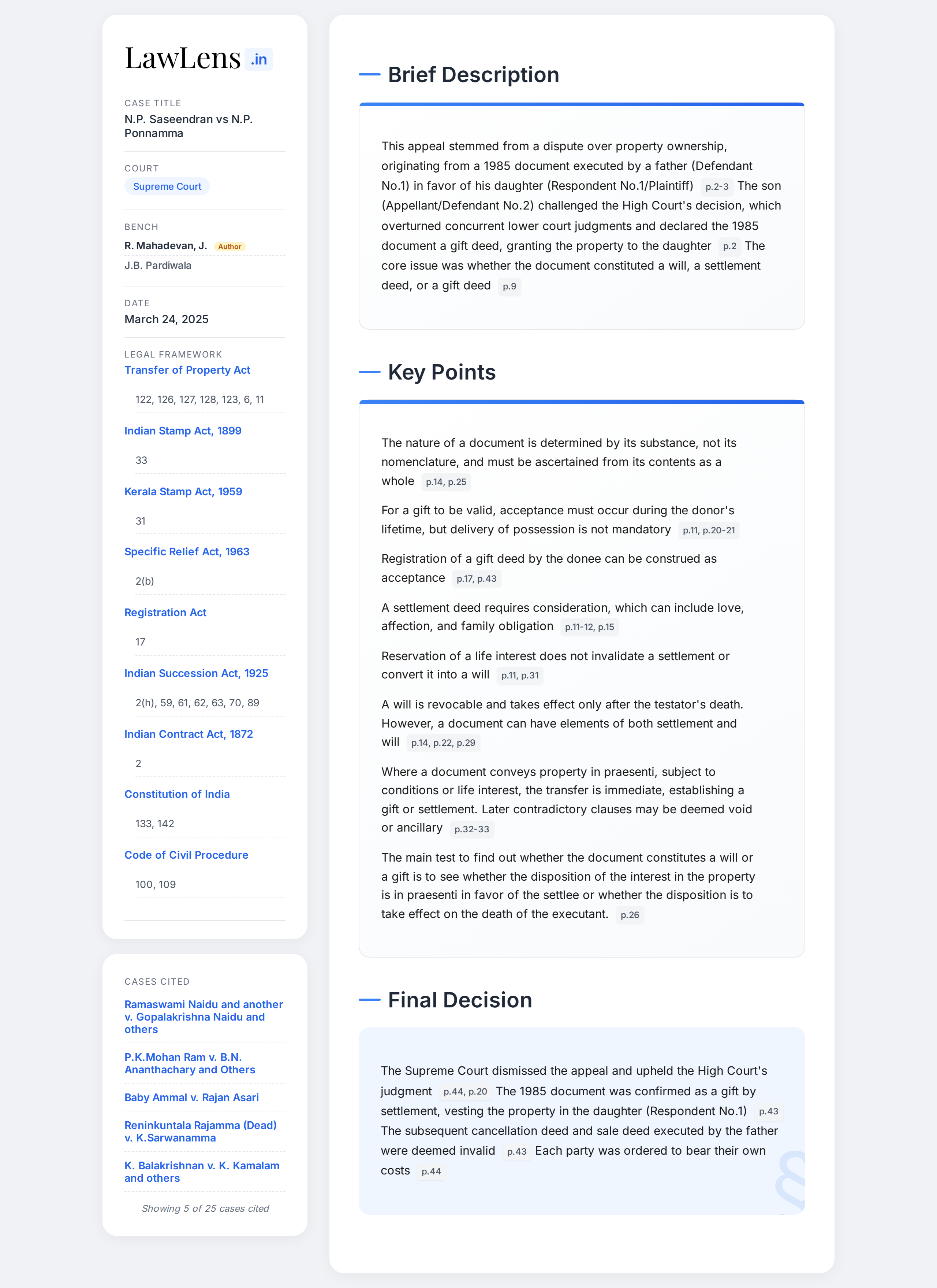 N.P. Saseendran vs N.P. Ponnamma 2025 INSC 388 - Gift, Settlement & Will