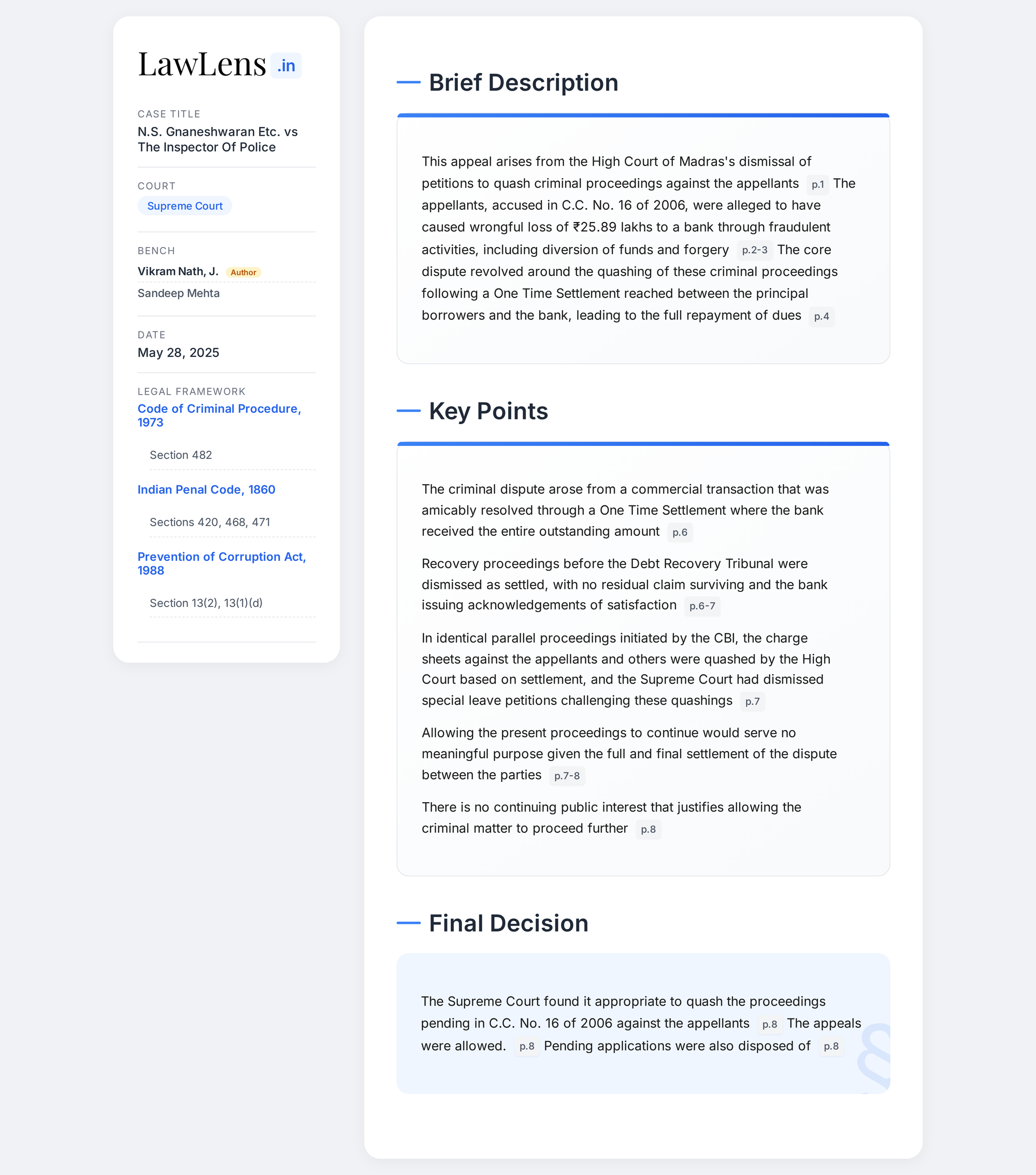 N.S. Gnaneshwaran vs Inspector Of Police 2025 INSC 787 - S.482 CrPC - Quashing On Settlement