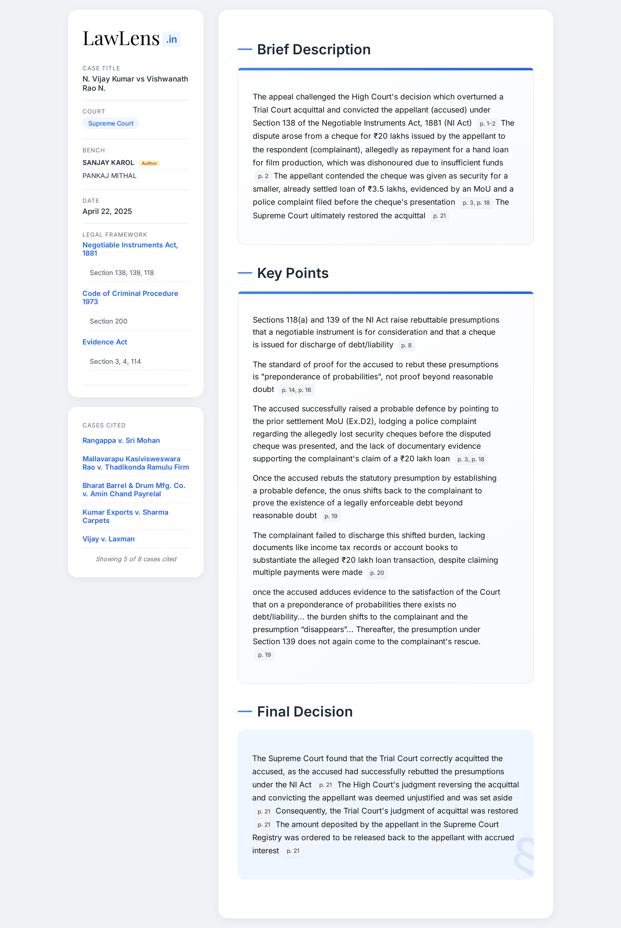 N. Vijay Kumar vs Vishwanath Rao N. 2025 INSC 537 - Ss. 138,139 NI Act - Cheque Bounce Case - Probable Defence
