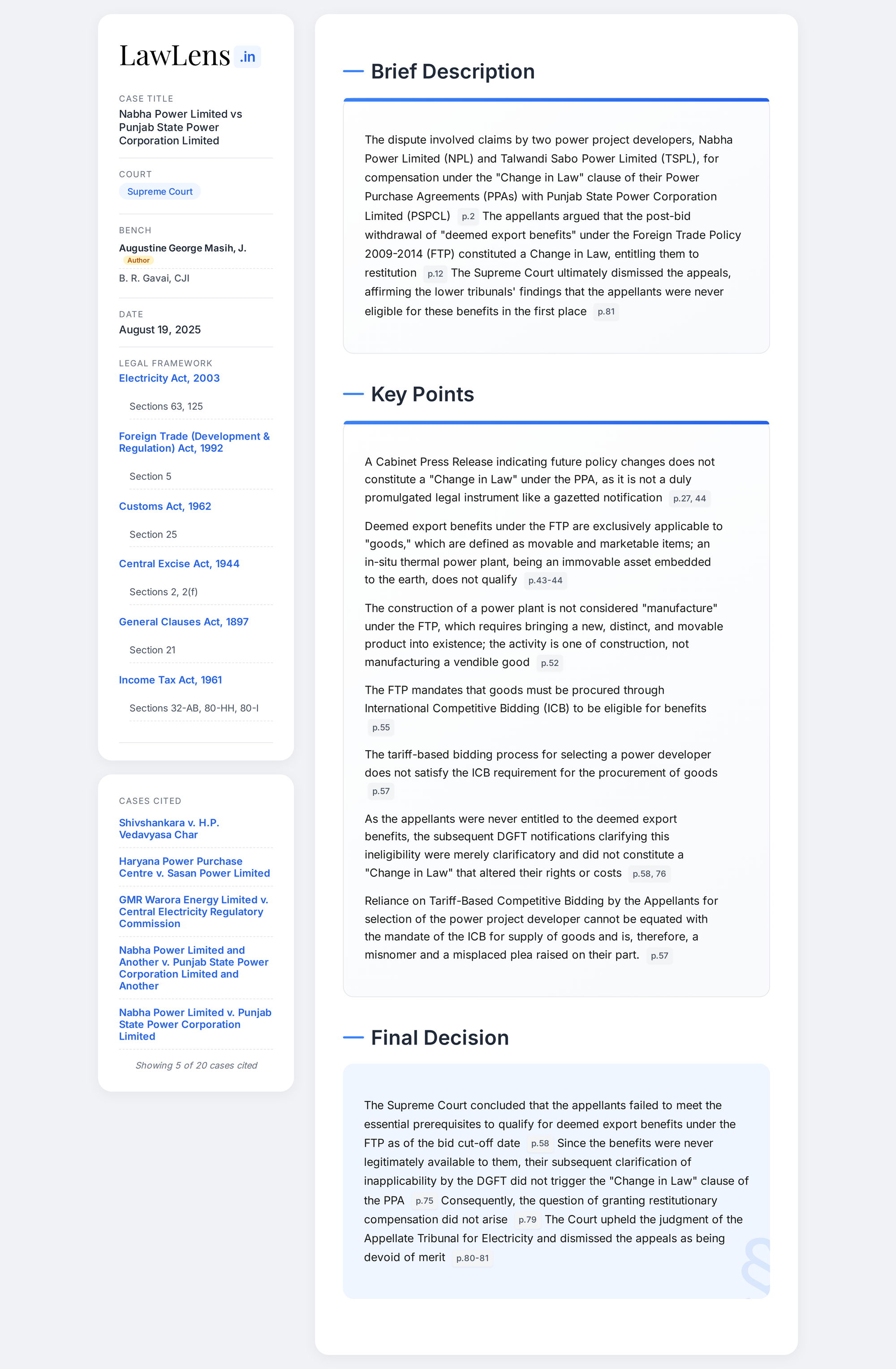 - Case Name: Nabha Power Limited v. Punjab State Power Corporation Limited & Others