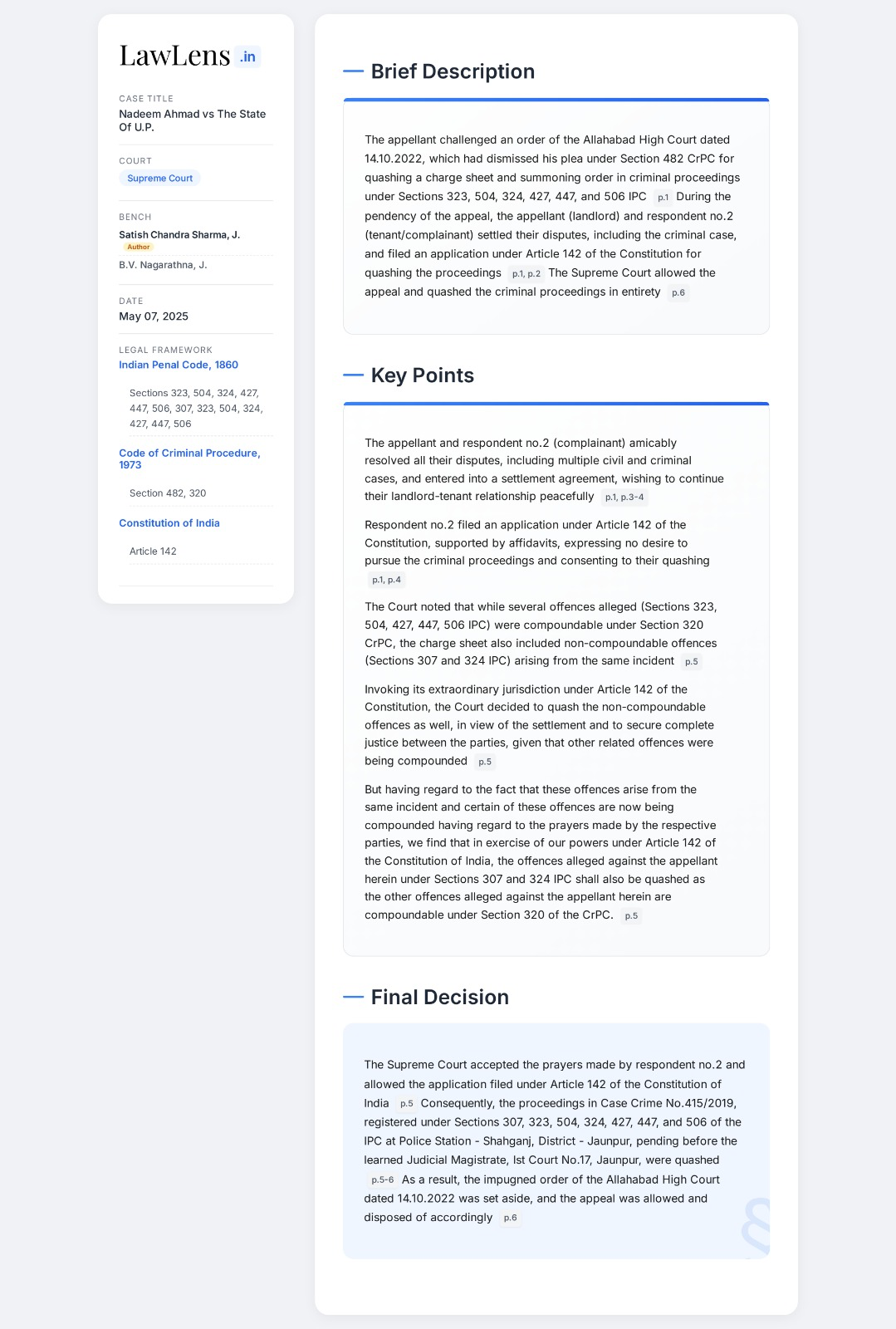 Constitution of India - Article 142 - Supreme Court quashed offences alleged against the appellant under Sections 307 and 324 IPC by invoking Article 142 powers as parties settled the matter.