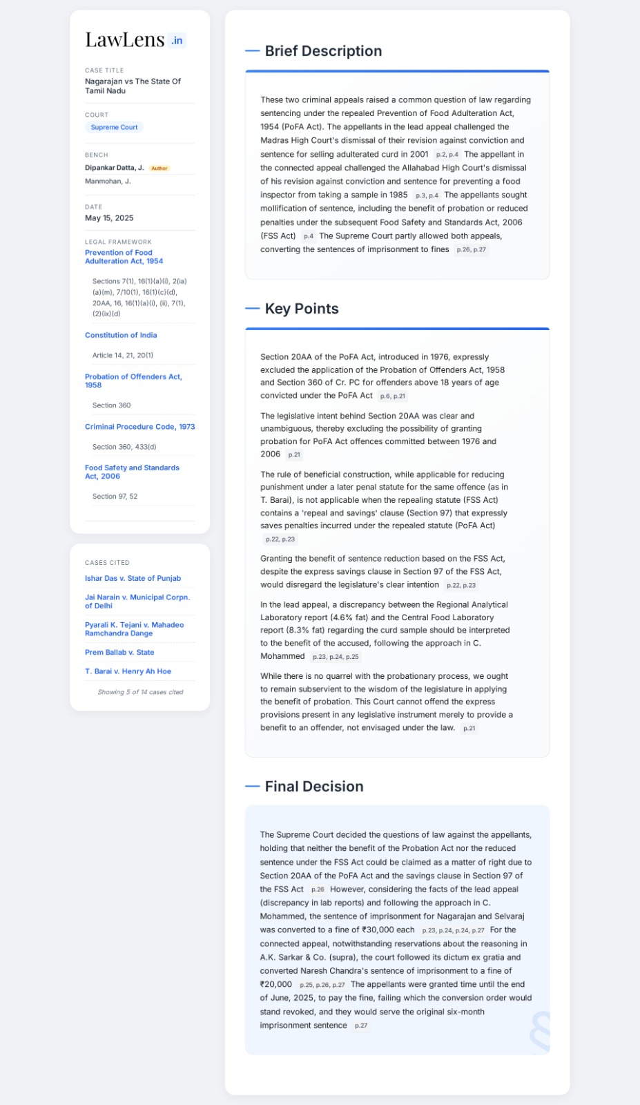 Nagarajan vs State Of Tamil Nadu 2025 INSC 703 -Prevention of Food Adulteration Act - Probation