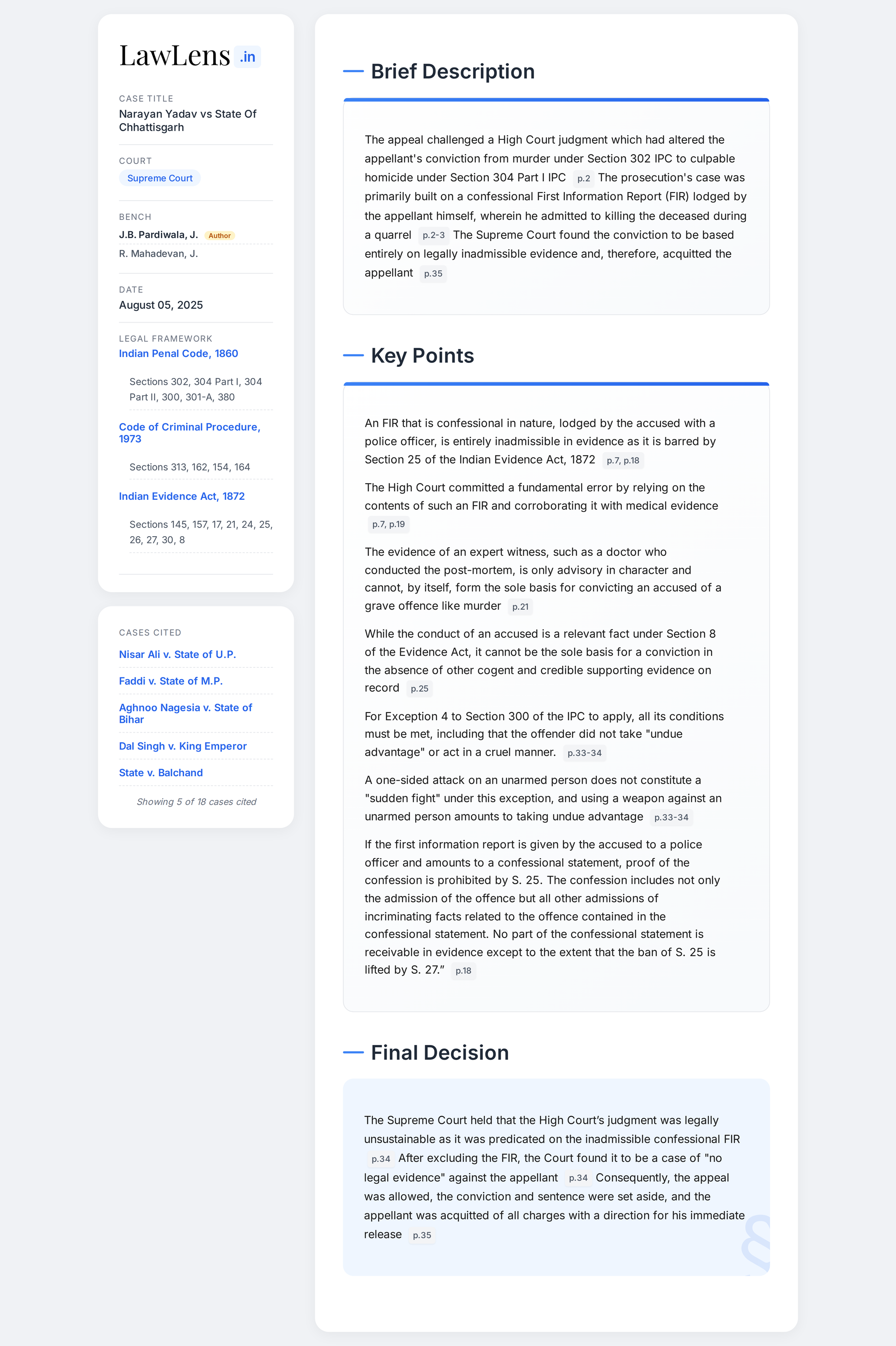 Narayan Yadav vs State of Chhattisgarh 2025 INSC 927 - Evidence Act - IPC - Confessional FIR