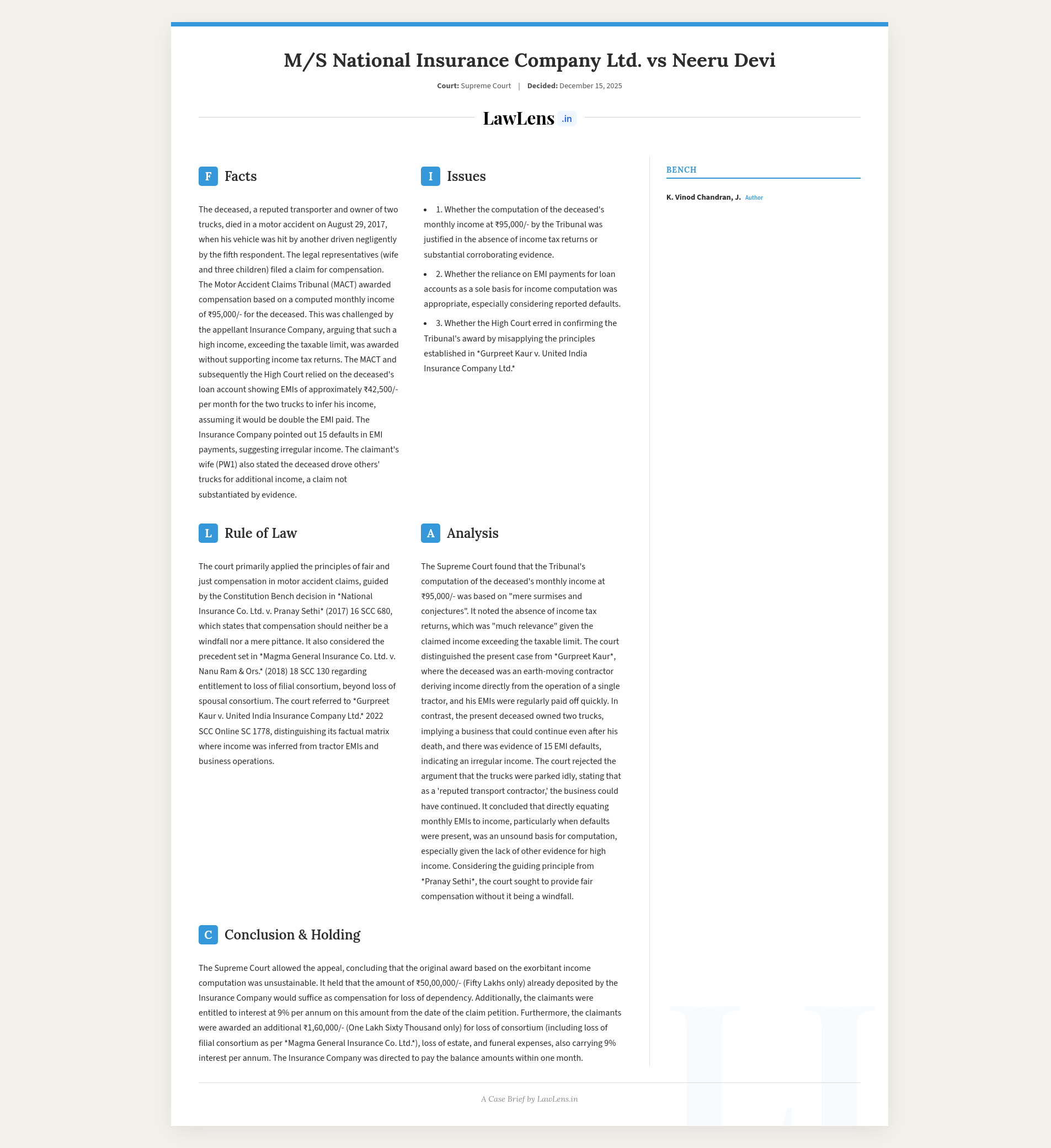 National Insurance Co. Ltd. v. Neeru Devi 2025 INSC 1430-Motor Accident Compensation