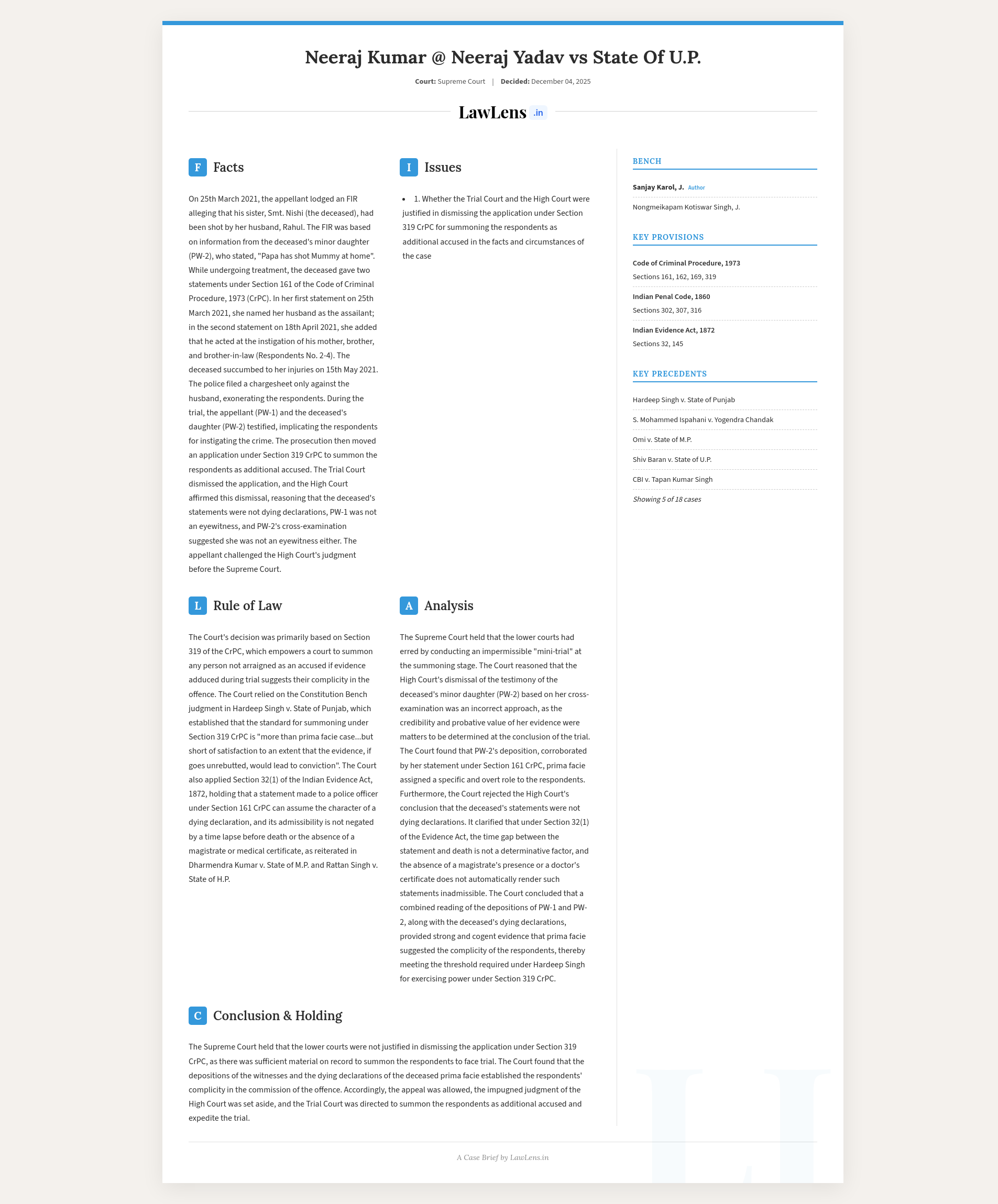 Neeraj Kumar @ Neeraj Yadav v. State of U.P. 2025 INSC 1386 - Evidence Act - Dying Declaration - S.319 CrPC