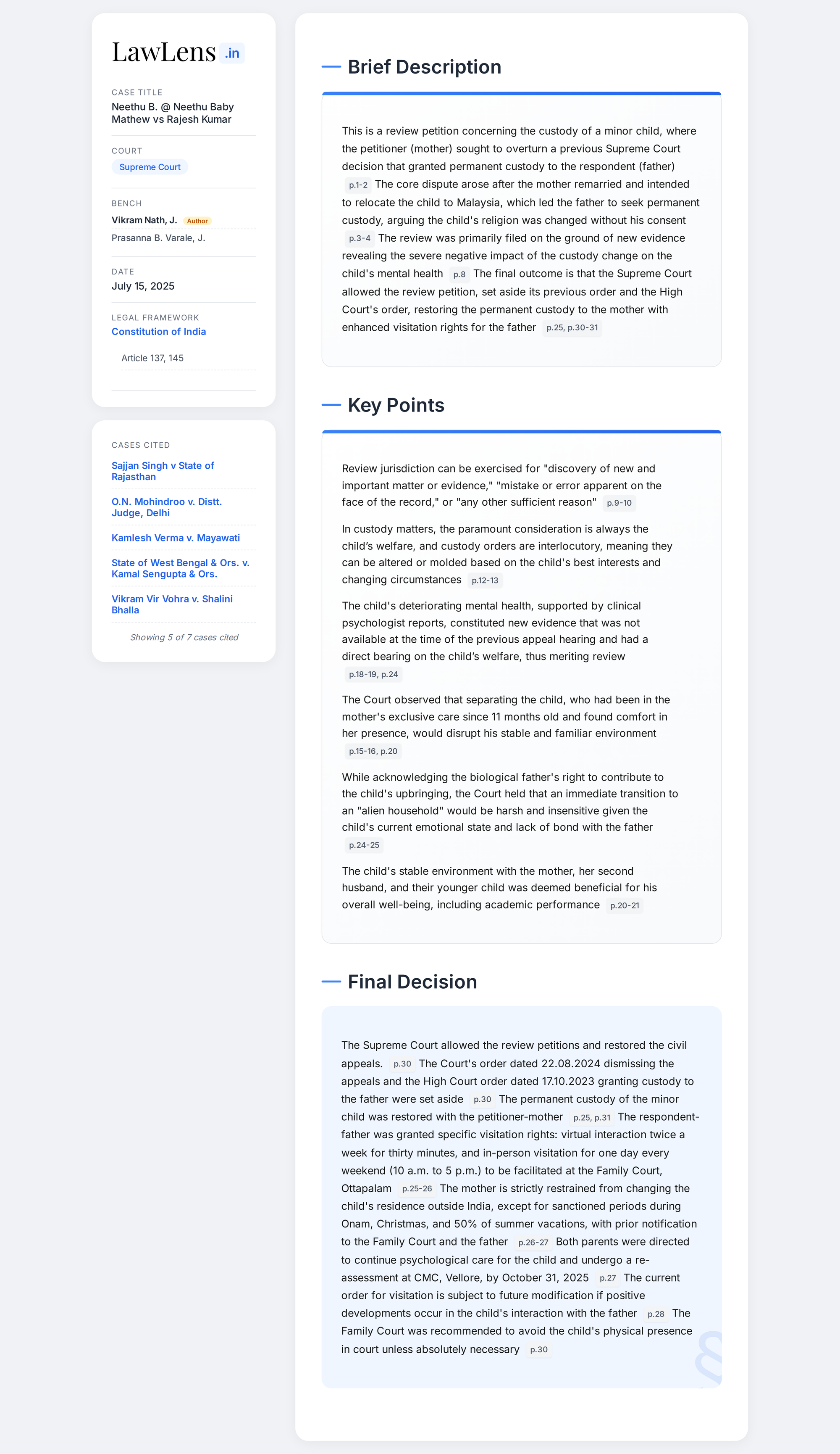 Neethu B. @ Neethu Baby Mathew vs. Rajesh Kumar 2025 INSC 853 - Child Custody Orders